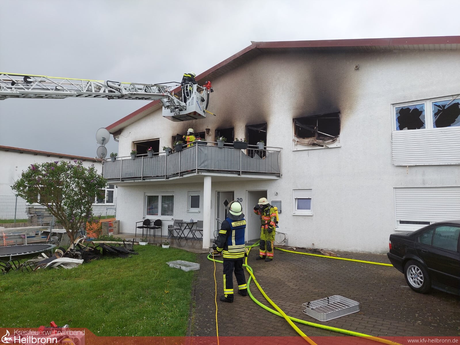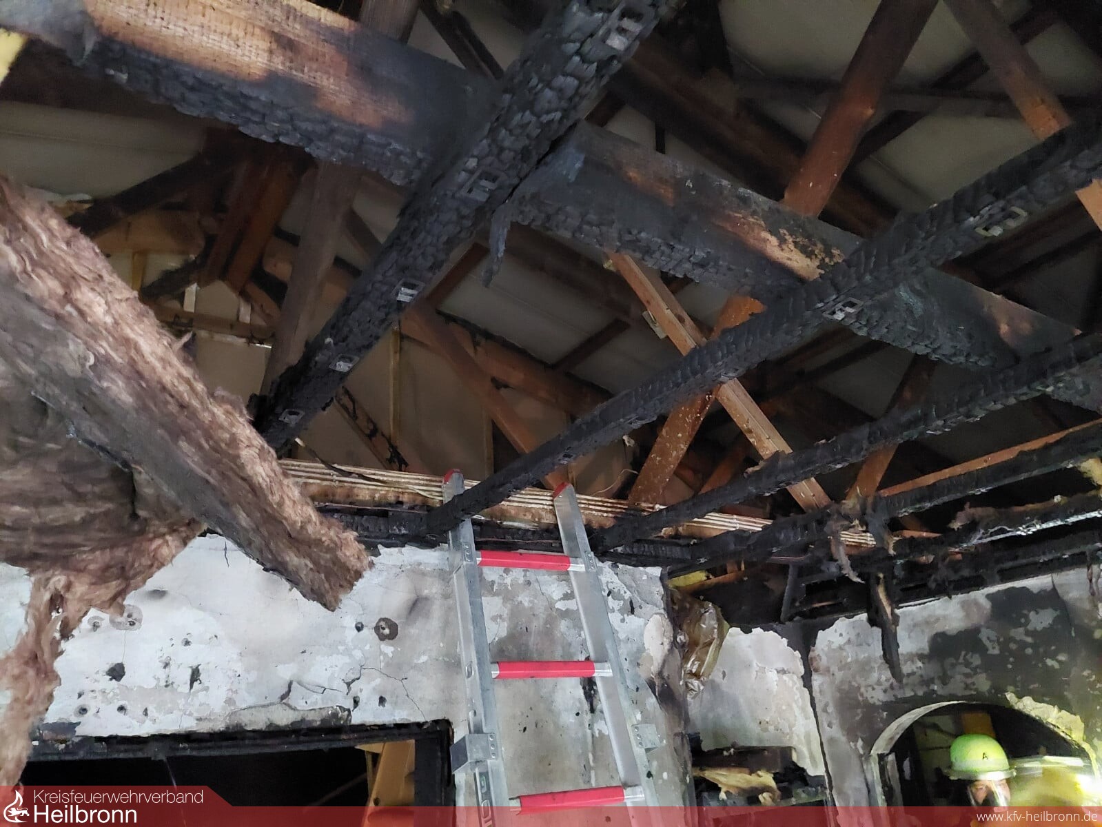 Die Feuerwehr Schwaigern wurde mit dem Einsatzstichwort „Zimmerbrand“ in den Gewerbering nach Schwaigern-Massenbach alarmiert. Beim Eintreffen der ersten Einsatzkräfte schlugen die Flammen bereits aus den Fenstern - im 1. OG eines Industrie-/Wohngebäudes stand eine Wohnung in Vollbrand. Nachdem sich keine Personen mehr in dem Gebäude befanden wurde umgehend die Brandbekämpfung mit zwei Trupps unter PA eingeleitet. Ein dritter Trupp unter PA erkundete die zunächst die Wohnung im Erdgeschoss und unterstützte dann bei der Brandbekämpfung. Da es sich um das Dachgeschoss handelte wurde die Feuerwehr Eppingen (Drehleiter) nachalarmiert. Aufgrund des hohen Bedarfs an Atemschutzgeräteträgern wurde weiter die Abteilung Niederhofen nachalarmiert sowie der Abrollbehälter „Atemschutz“ der Berufsfeuerwehr Heilbronn angefordert. Das Feuer konnte rasch unter Kontrolle gebracht werden. Ein Übergreifen der Flammen auf die hinter der Wohnung befindliche Lagerhalle konnte verhindert werden. Im weiteren Verlauf wurde die Decke der Wohnung zum Dachstock hin entfernt um weitere Glutnester abzulöschen. Abschließend wurde das komplette Gebäude mit der Wärmebildkamera kontrolliert. Die Wohnung im Dachgeschoss ist nicht mehr bewohnbar. Die Wohnungen im Erdgeschoss wurden durch das Löschwasser stark in Mitleidenschaft gezogen und sind derzeit ebenfalls nicht mehr bewohnbar.