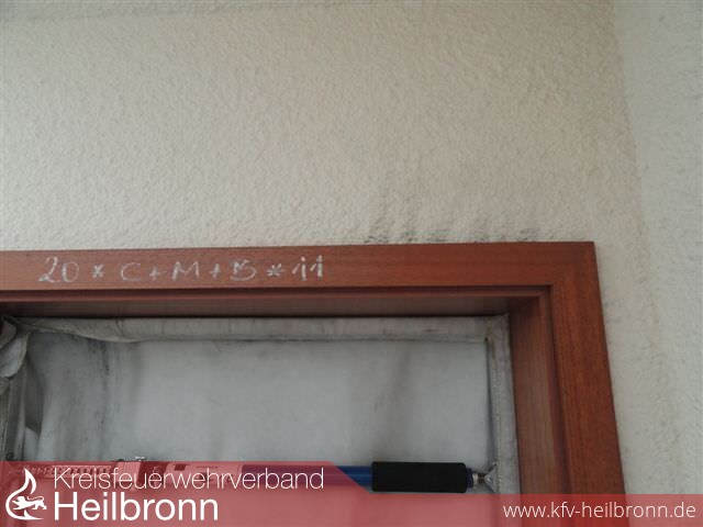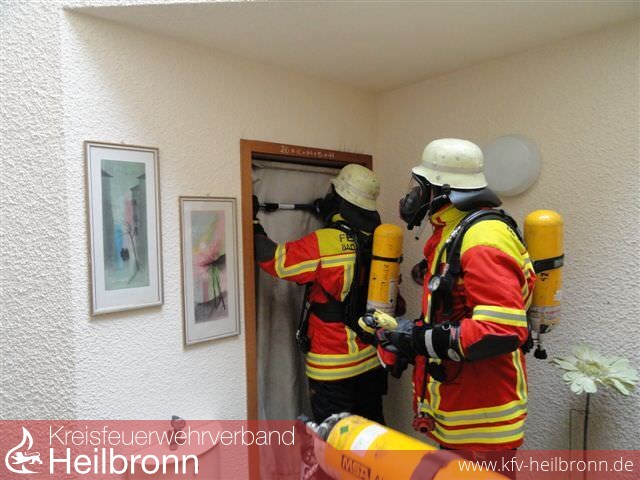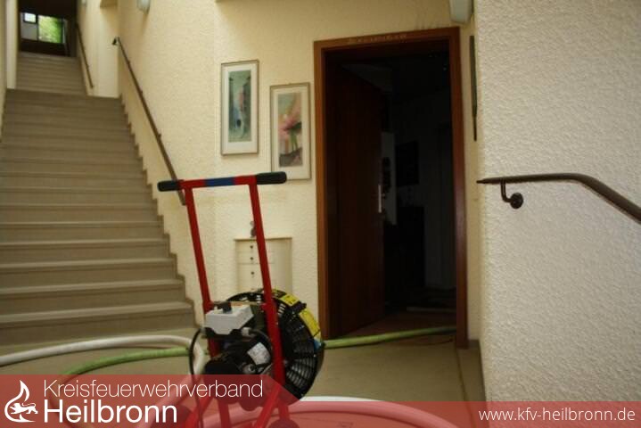 Nach Anbringung eines Rauchvorhangs konnte die Wohnung mit einem von Bekannten bereitgestellten Schlüssel geöffnet werden, ein Drei- mann- Trupp ging unter Atemschutz mit einem C-Rohr und Wärmekamera in die total verrauchte Wohnung vor. Zudem wurde ein Lüfter vor den Flur gesetzt und im oberen Teil des Flurs eine Abzugsöffnung (Öffnen einer Türe) geschaffen.