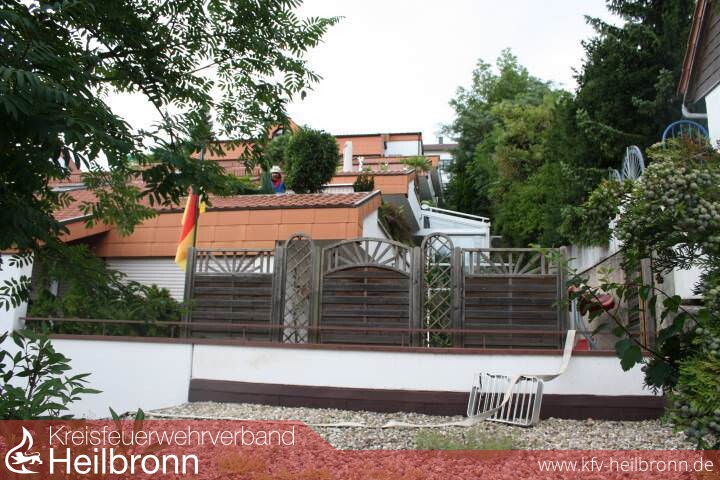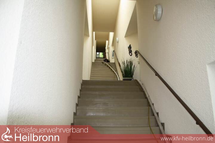Aus einer Wohnung in der 2. Etage eines in den Hang gebauten Mehrfamilienterrassenhauses mit insgesamt neun Wohnungen drang Rauch aus einem Fenster und durch die Wohnungstüre ins Treppenhaus.