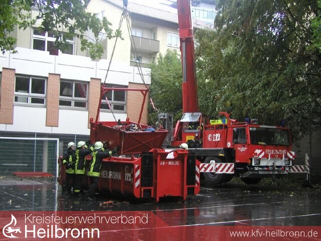 In eine am Feuerwehrkran hängenden Schuttmulde wurde der teils noch brennenden Brandschutt verladen und am Boden vollständig abgelöscht. Somit konnte in dem Gebäude ein Wasserschaden verhindert werden.