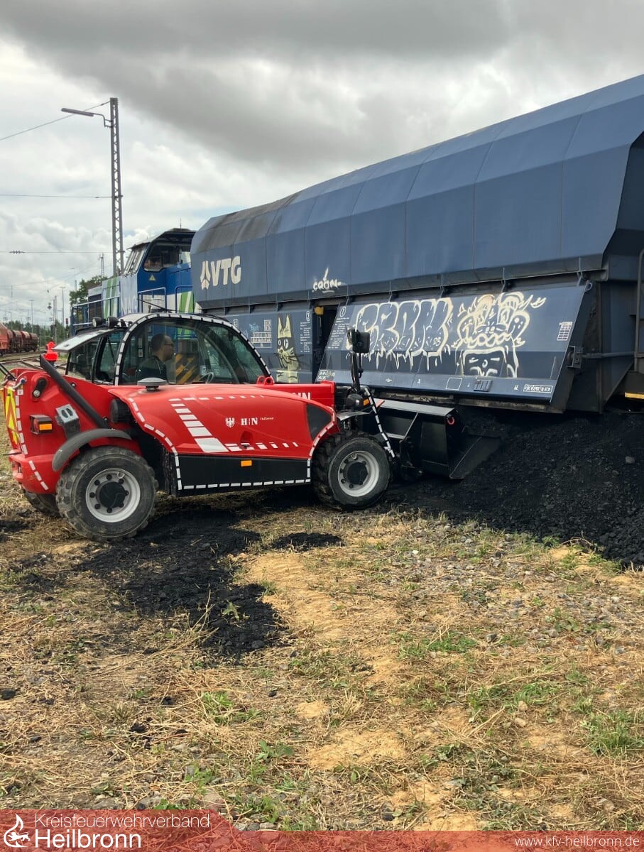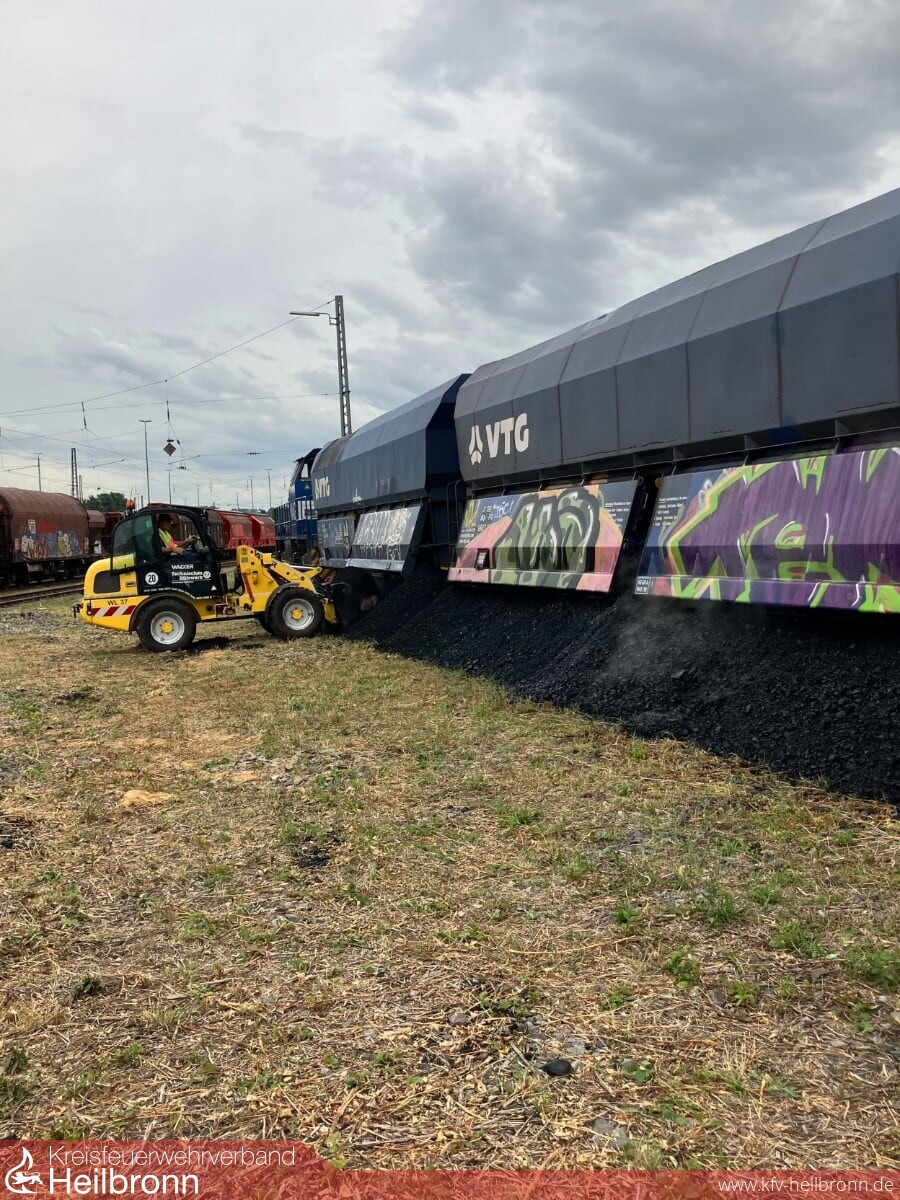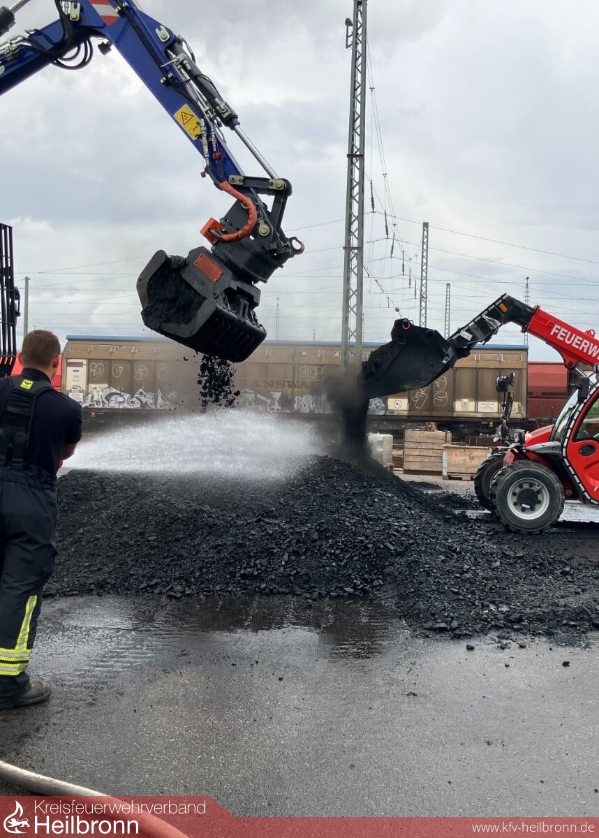 Am gestrigen Montag rückten die Einsatzkräfte der Feuerwehr Heilbronn wieder zu etlichen Einsätzen aus. Gleich gegen 10 Uhr kam es zu einem Schwelbrand an zwei mit Kohle beladenen Güterwaggons beim Güterbahnhof in der Eisenbahnstraße. Der Inhalt wurde entladen und mit Radladern und einem Bagger des Technischen Hilfswerkes (THW) in mehrstündiger Arbeit verteilt und abgelöscht.