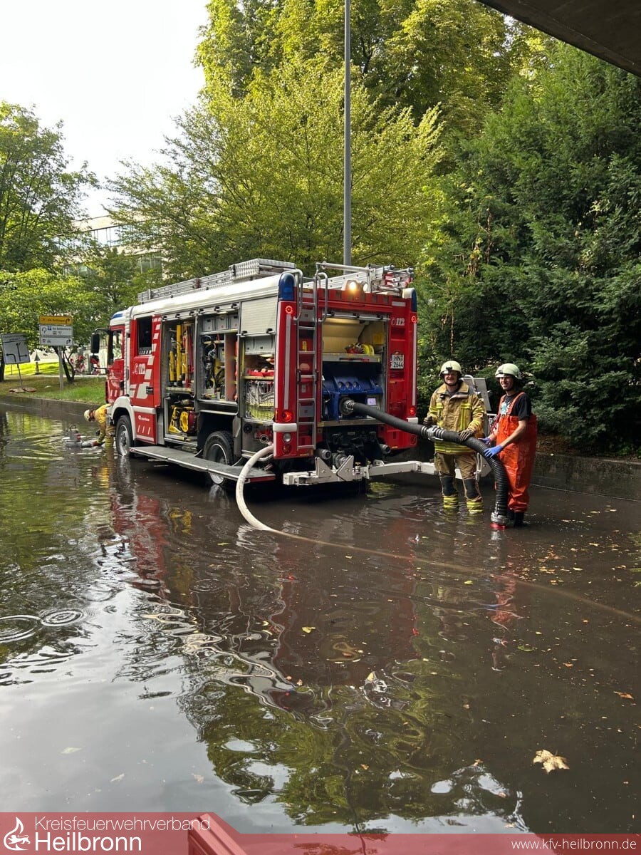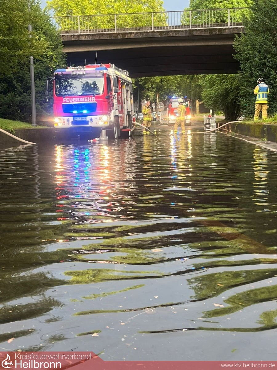 Kurz nach 17 Uhr schlug das bereits angekündigte Unwetter zu. Eine Gewitterfront sorgte im Stadtkreis für rund 40, und im Landkreis für 30 Einsätze. Schwerpunkte waren vollgelaufene Unterführungen, Keller sowie auch einige Tiefgaragen standen voll mit Wasser. Auch abgebrochene Äste beschäftigten die Einsatzkräfte. Besonders betroffen waren die Heilbronner Innenstadt und die Stadtteile Sontheim, Horkheim und Böckingen.