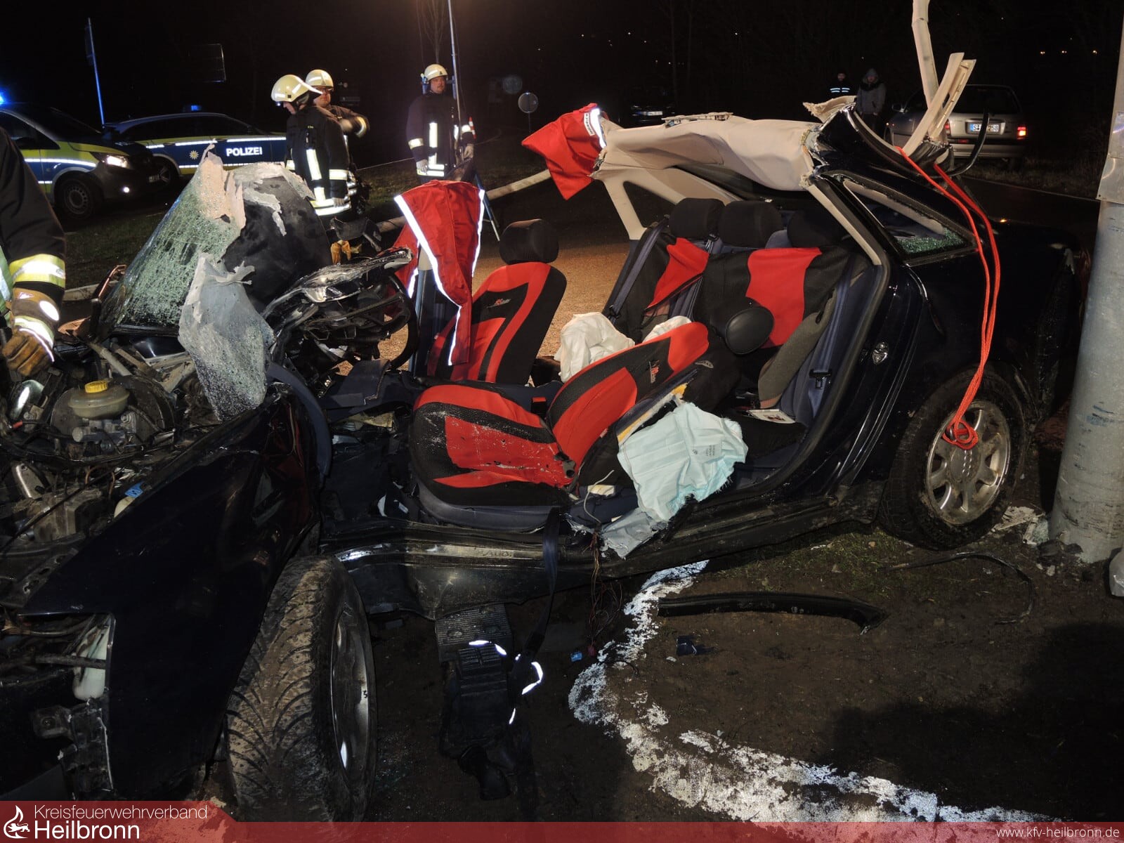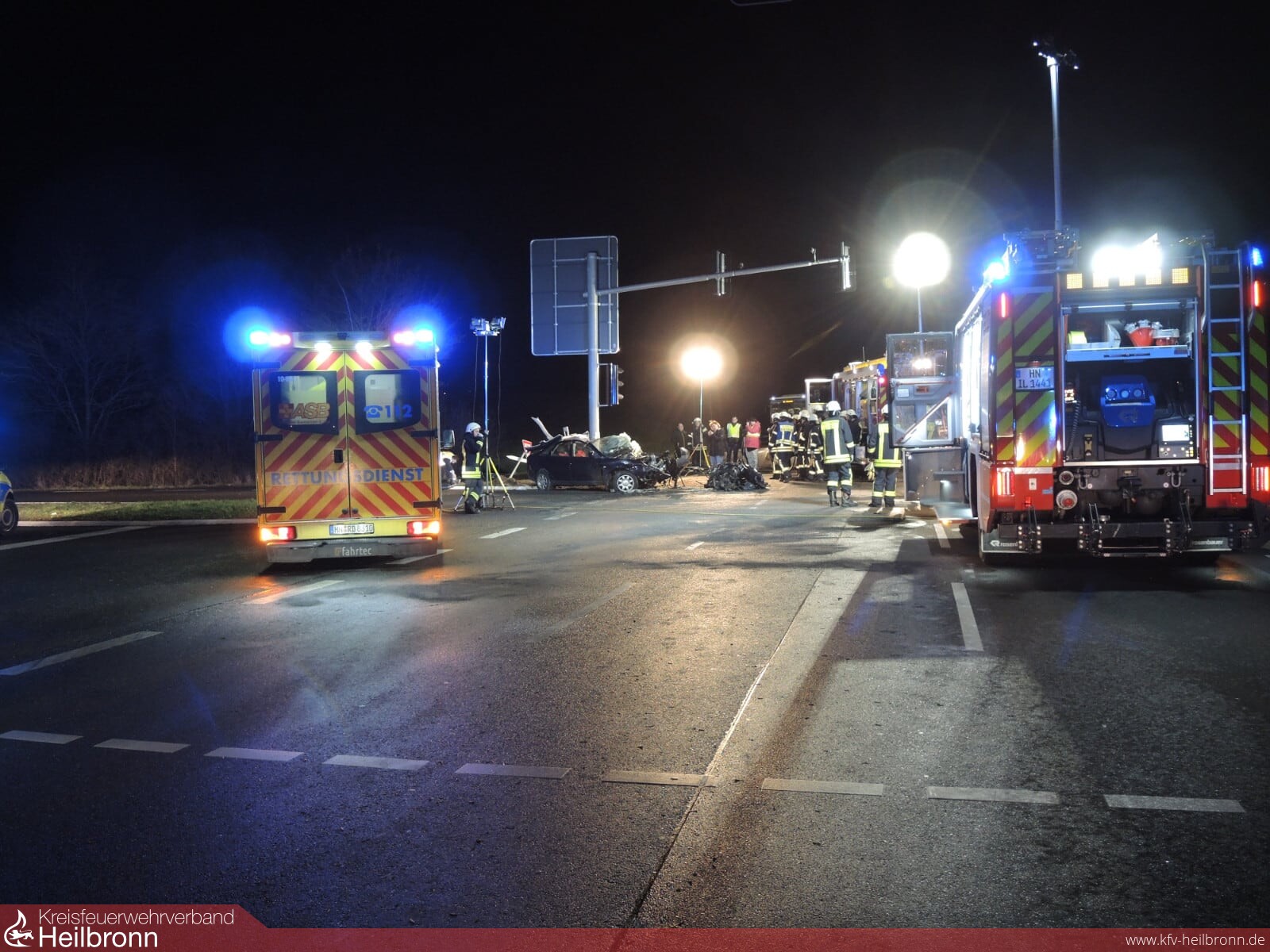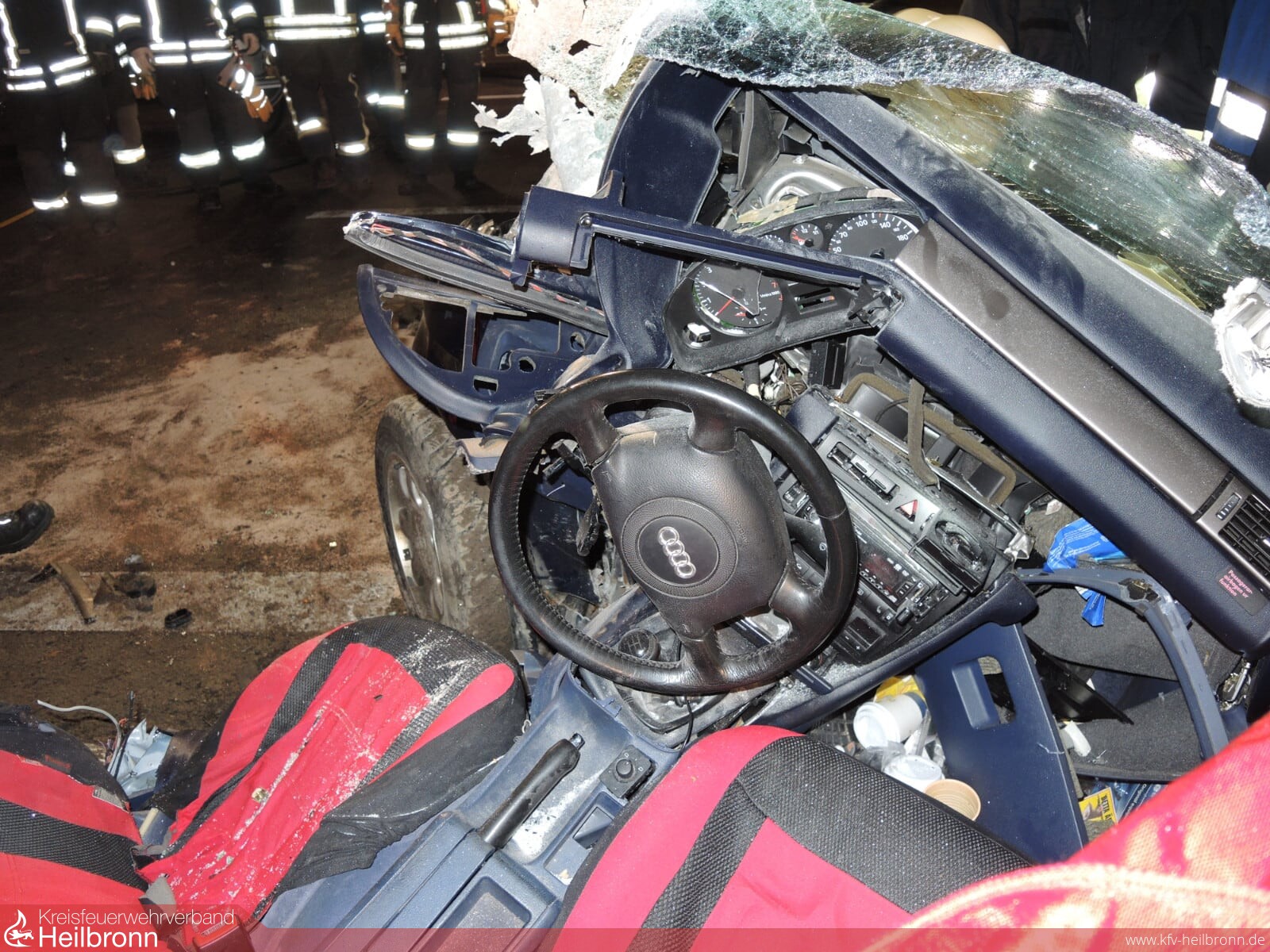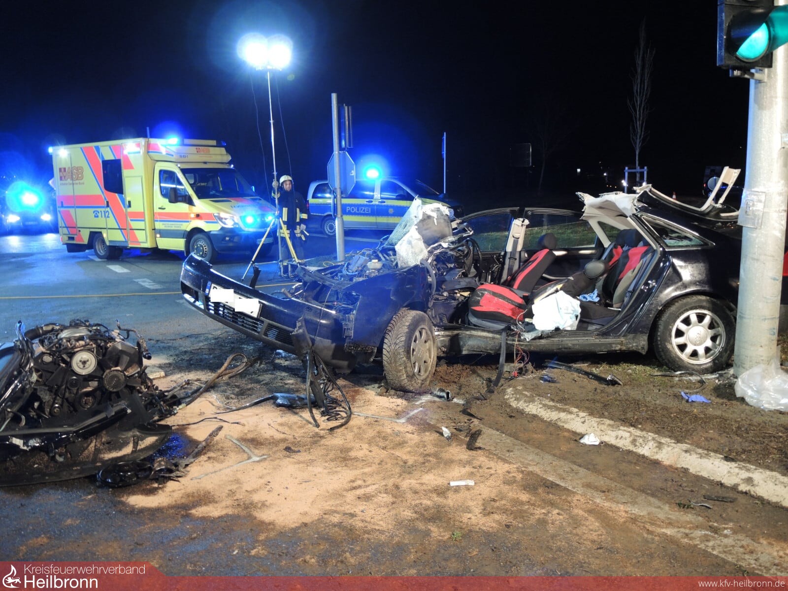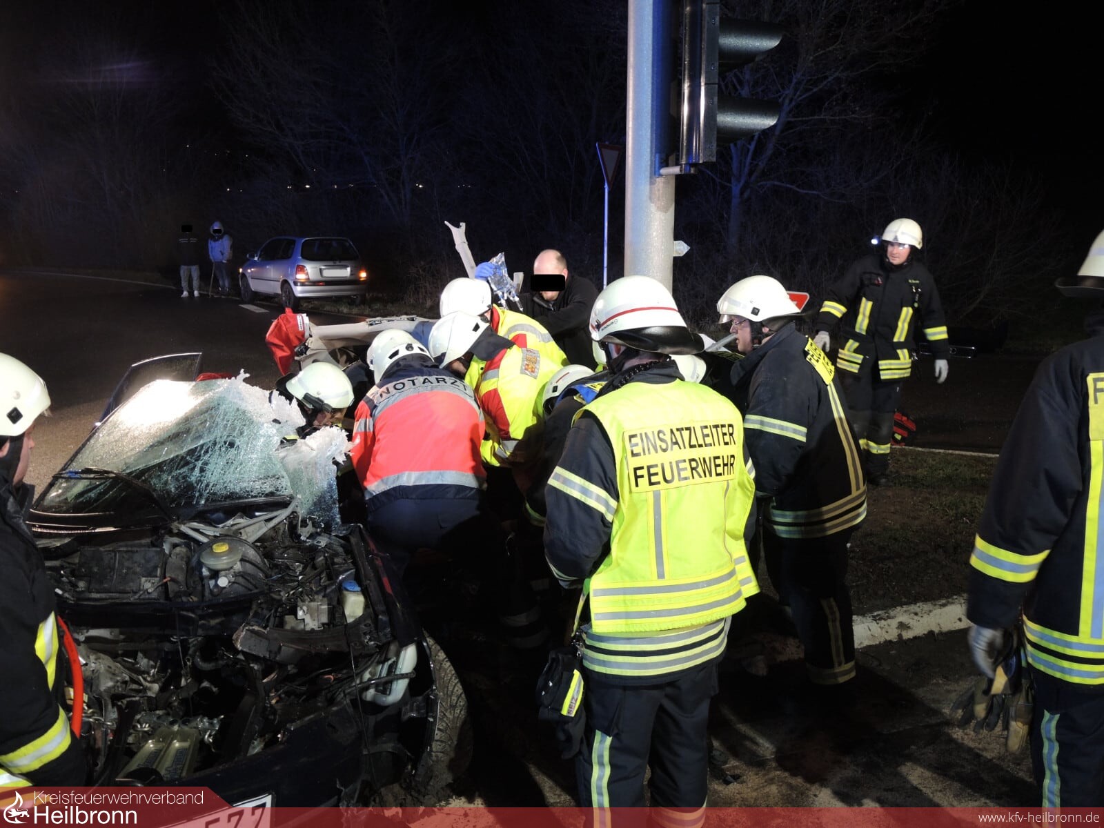 Noch während die Feuerwehrfahrzeuge vom PKW Brand wieder einsatzbereit gemacht wurden, ging um 21:45 Uhr der vierte Alarm an diesem Sonntag ein. Zwischen Ilsfeld und Beilstein kurz vor der Abzweigung nach Abstetterhof verlor ein 51-Jähriger die Kontrolle über sein Auto, schleuderte frontal auf eine Verkehrsinsel und mit der Fahrerseite gegen einen massiven Ampelmast. Dort verkeilte sich das Fahrzeug und drehte sich quer zur eigentlichen Fahrtrichtung. Der Motor des Fahrzeuges wurde durch den Aufprall herausgerissen und lag auf der Fahrbahn. Der Fahrer wurde in seinem Auto im Beinbereich sehr stark eingeklemmt. Zur Rettung des Mannes mussten mehrere hydraulische Rettungsgeräte sowie ein Greifzug eingesetzt werden. Nachdem der Mann aus dem Fahrzeugwrack befreit war, wurde er mit einem RTW ins Krankenhaus gebracht.