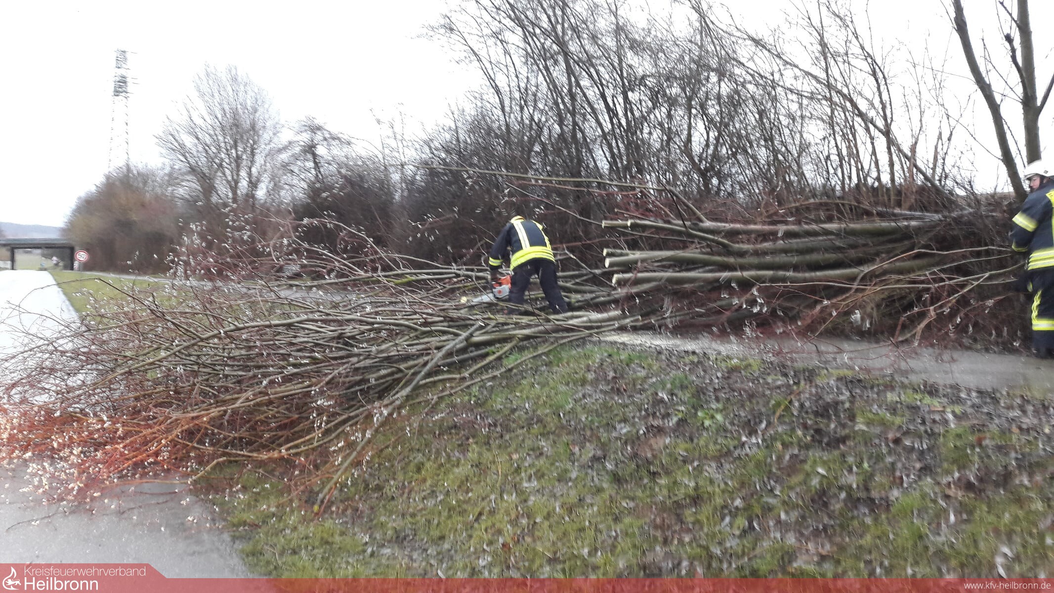 Noch während des Einsatzes mit den umgefallenen Bauzäunen wurde die FW Ilsfeld in den Burgweg alarmiert. Dort vielen aufgrund des Sturmes mehrere Bäume um und blockierten den Radweg sowie ein Teil der Fahrbahn. Die Bäume wurden mit einer Motorsäge zersägt und beiseite geräumt. Im Einsatz waren der Kommandowagen und das LF20.
