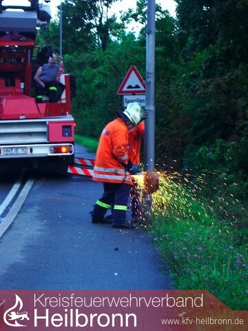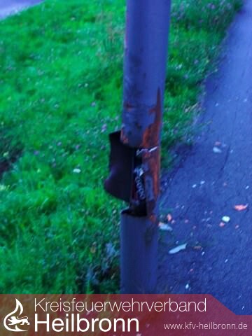 Der angefahrene Lichtmast war so stark beschädigt, dass er umzufallen drohte. Er wurde daher von einem Feuerwehrelektriker stromlos gemacht und unter Einsatz der Drehleiter und eines Trennschleifers abgeschnitten und zur Seite gelegt.