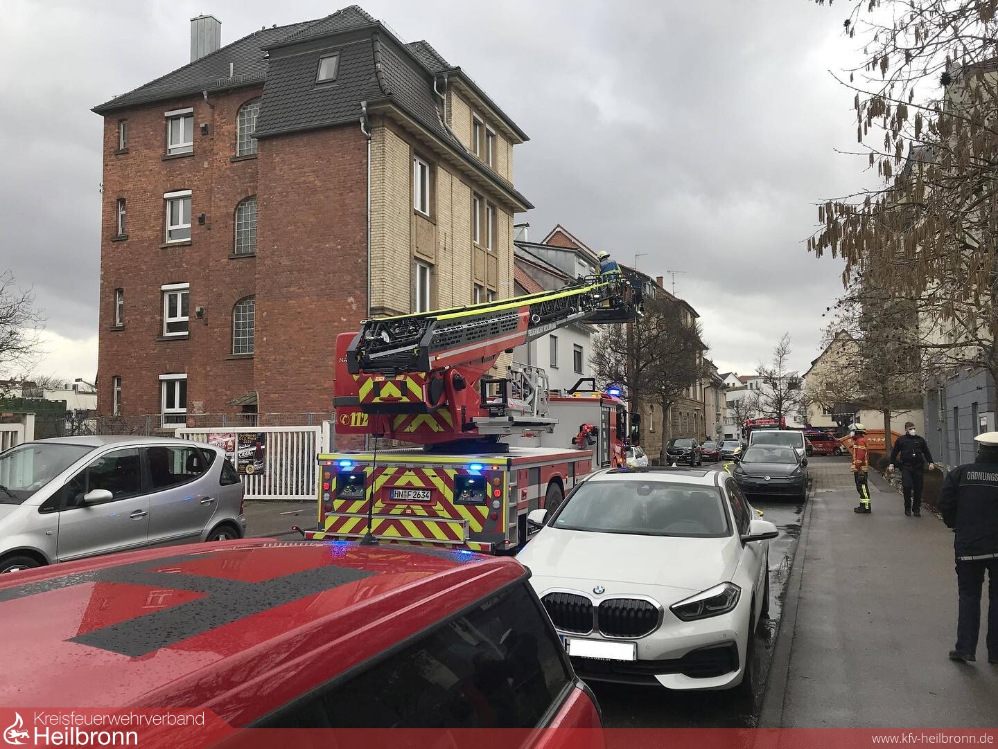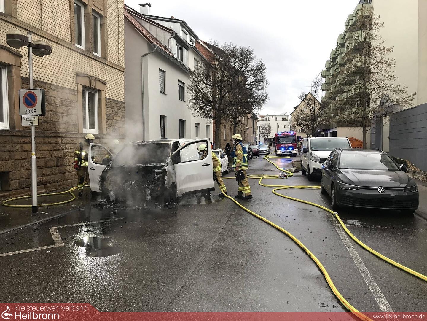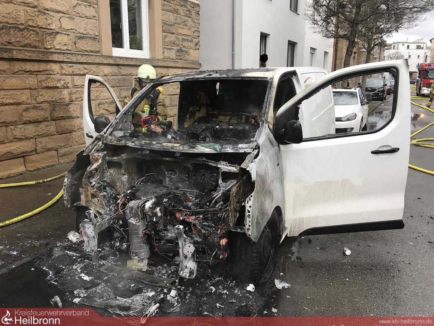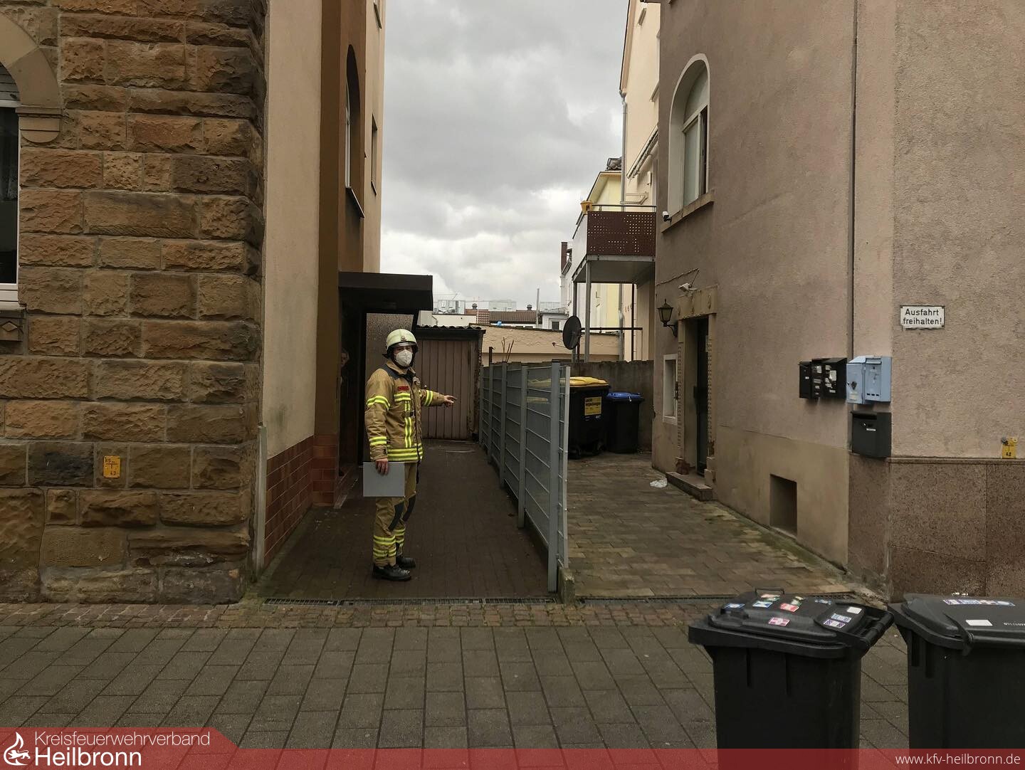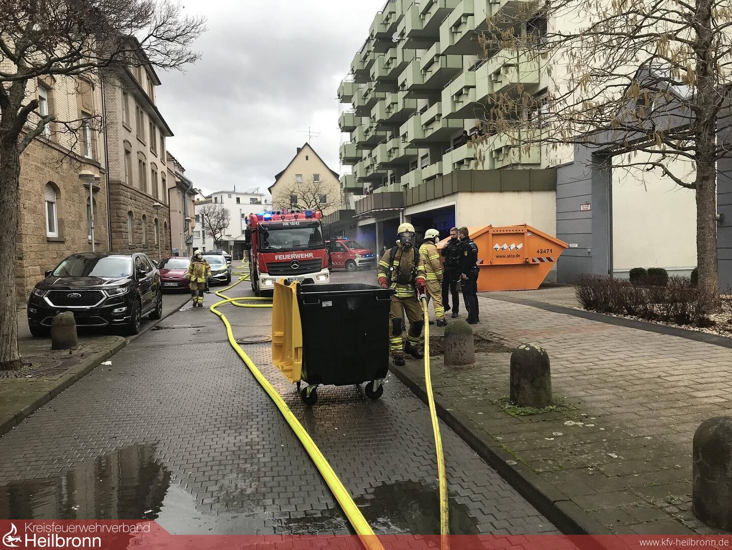Heute kurz nach 11 Uhr brannte ein geparkter Transporter im Motorbereich in der Achtungstraße. Noch während den Löscharbeiten wurde den Einsatzkräften ein weiteres Feuer nur vier Häuser weiter gemeldet. Sofort machten sich zwei Einsatzkräfte auf den Weg zur nächsten Brandstelle. Vor Ort konnten sie einen rauchenden 1100 Liter Müllcontainer feststellen und aus dem Eingangsbereich herausziehen. Da die Nachlöscharbeiten an dem Transporter noch im Gange waren bot es sich an, diese „Einsatzstelle“ zum Löschfahrzeug zu schieben. In Anbetracht der Situation in dem Hofeingang mit weiteren Mülltonnen, Fenstern und einem Balkon in der Nähe kann man hier auch von Glück reden, dass dieser Brand rasch entdeckt wurde.