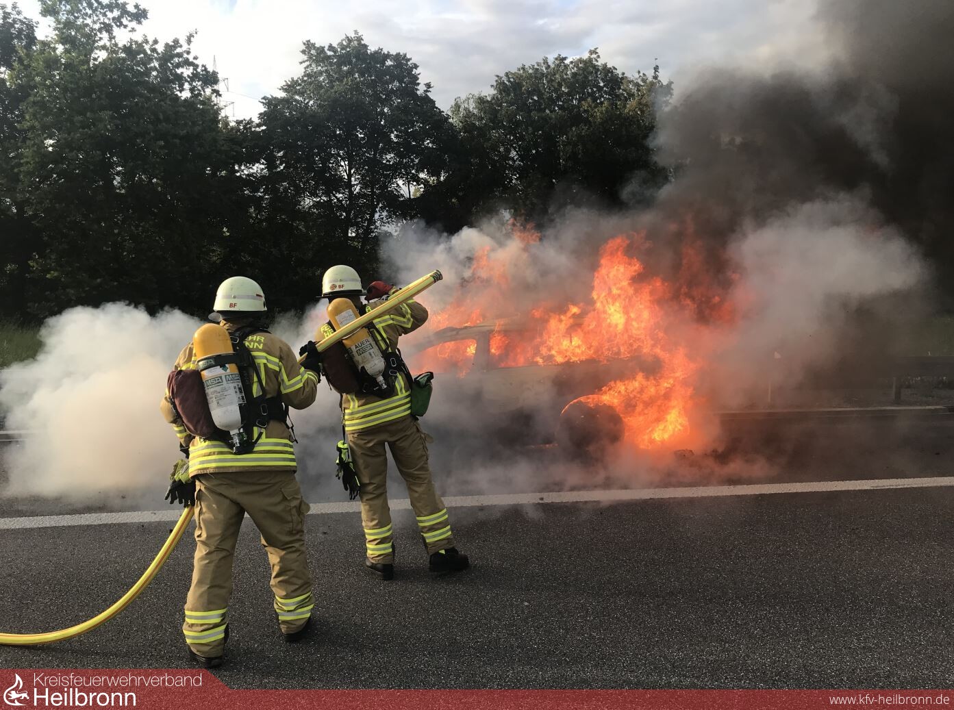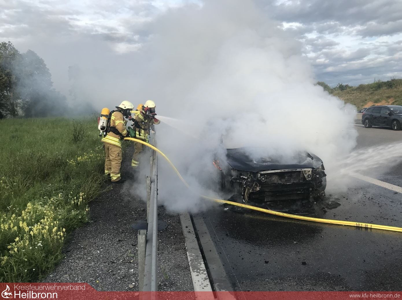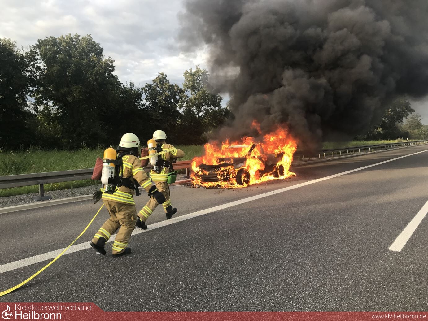 Nur 12 Minuten versetzt brannten gestern Abend zwei Fahrzeuge in voller Ausdehnung . Der Halbzug hatte gerade einen Brandmeldealarm in einer Kindertagesstätte abgeschlossen, als um 19.23 Uhr ein Pkw auf der Autobahn 6 in Flammen stand. Das Feuer konnte mit zwei Rohren von der Berufsfeuerwehr sowie der Abteilung Heilbronn -Stadt-, welche die Verkehrsabsicherung übernahm, gelöscht werden. Ein wesentlich größeres Fahrzeug machte bereits um 19.35 Uhr durch eine massive Rauchsäule im Stadtteil Kirchhausen auf sich aufmerksam. Dort war ein Großtraktor mit Anbaugeräten bei Feldarbeiten in Brand geraten. Einsatzkräfte der Berufsfeuerwehr sowie von den Abteilungen Kirchhausen, Biberach und Heilbronn -Stadt- löschten die Flammen mit vier Rohren. Als Puffer zur Wasserversorgung kam der Abrollbehälter Tank/Wasser zum Einsatz, welcher im Pendelverkehr mit drei Löschfahrzeugen nachgefüllt wurde.