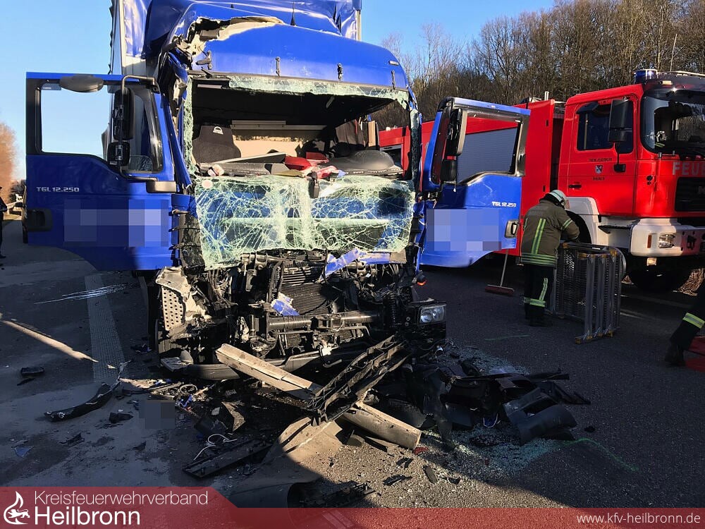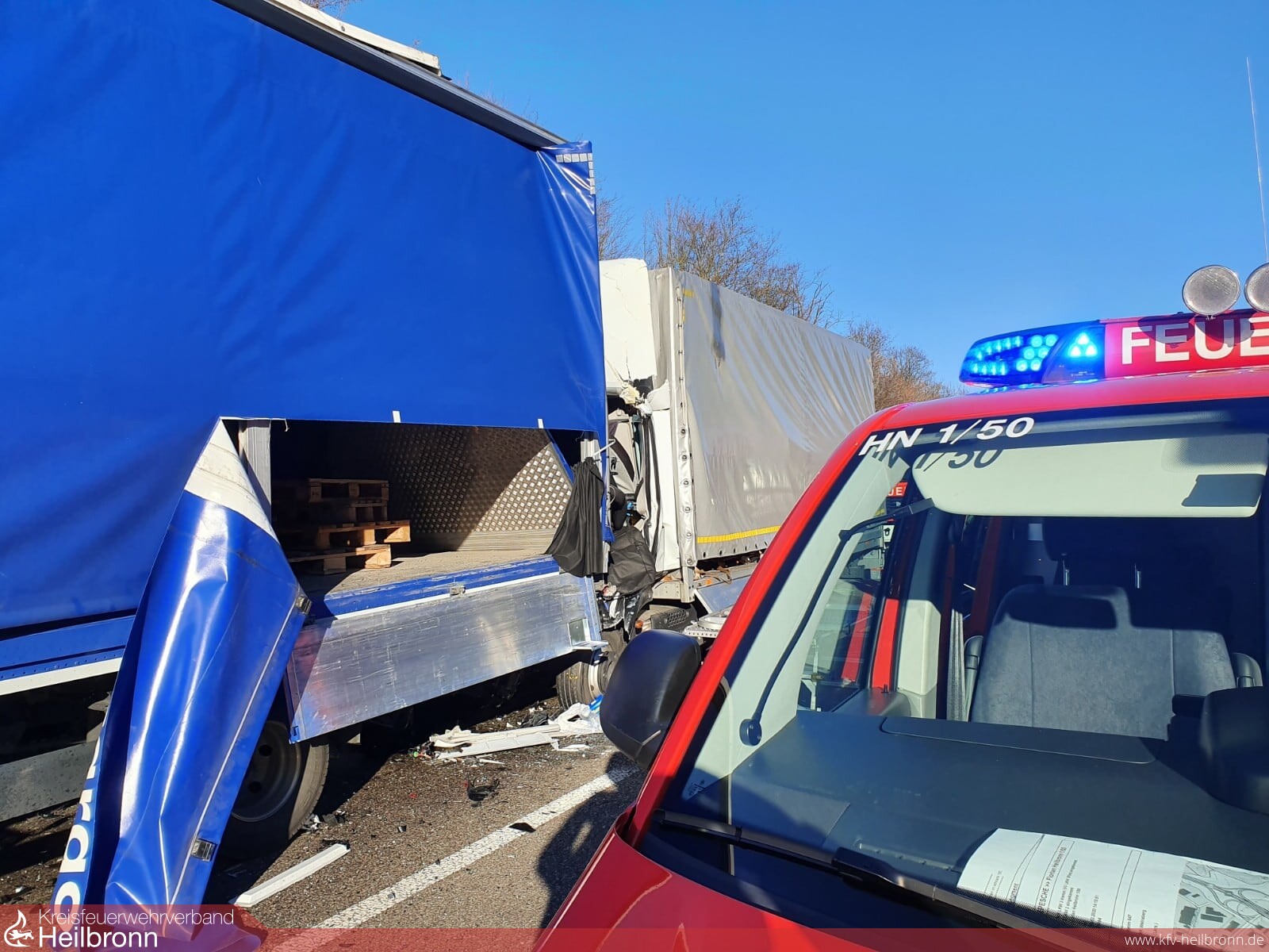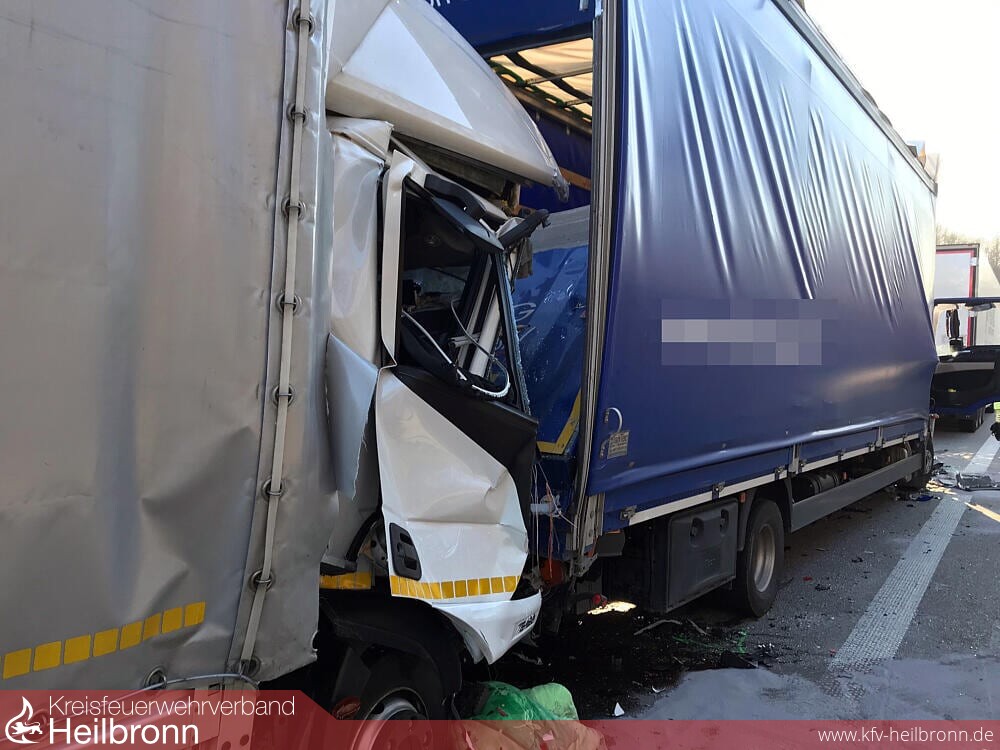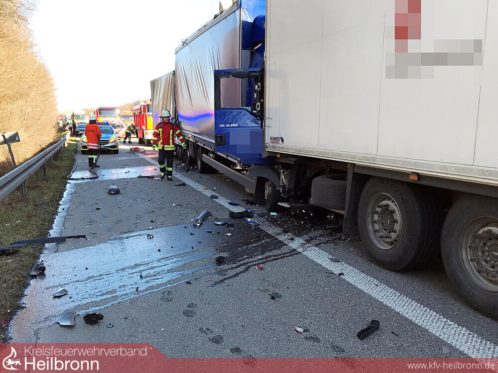 Erneut rückte die Feuerwehr Heilbronn gegen 14.00 Uhr mit dem Feuerwehrkran zu einem Lkw-Unfall in den Hohenlohekreis aus. Auf der Autobahn A6 zwischen Bretzfeld und dem Kreuz Weinsberg waren drei Lkw mit hoher Geschwindigkeit an einem Stauende aufeinander aufgefahren. Für die beiden Fahrer in den hinteren Fahrzeugen kam jede Hilfe zu spät. Zur Bergung mussten die Einsatzkräfte mehrere hydraulische Rettungsgeräte zum Einsatz bringen.