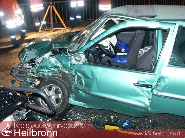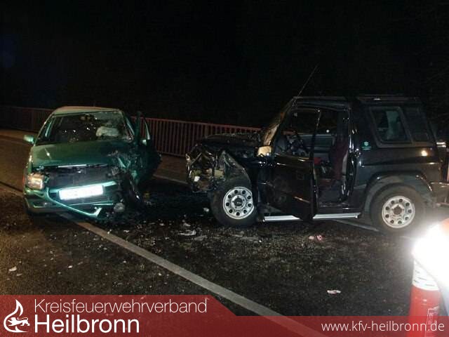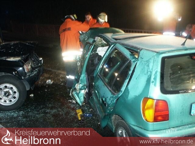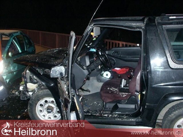 Bei einem Verkehrsunfall auf der Jagst- Brücke bei Heuchlingen (K2159), bei dem zwei PKW's bei Glatteis aufeinander stießen, wurde die Fahrerin des VW- Polo in dem Fahrzeug eingeklemmt und musste mit hydraulischem Rettungsgerät von der Feuerwehr befreit werden. Auch der Fahrer des zweiten Unfallfahrzeuges wurde verletzt.