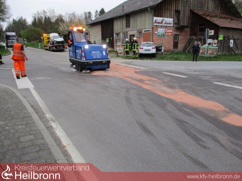 Um 17:48 Uhr wurde die Wehr zur Kreuzung Pfahlhof gerufen. Dort wurde ein Verkehrsunfall zwischen zwei PKW vorgefunden. Die Feuerwehr übernahm die Betreuung der beiden Fahrerinnen, die noch in ihren Autos saßen, aber nicht eingeklemmt waren. Anschließend wurden die beiden leicht Verletzten an den Rettungsdienst übergeben und in Krankenhäuser gebracht. Mit der Nassreinigung der großflächig verschmutzten Kreuzung wurde eine Fachfirma beauftragt.