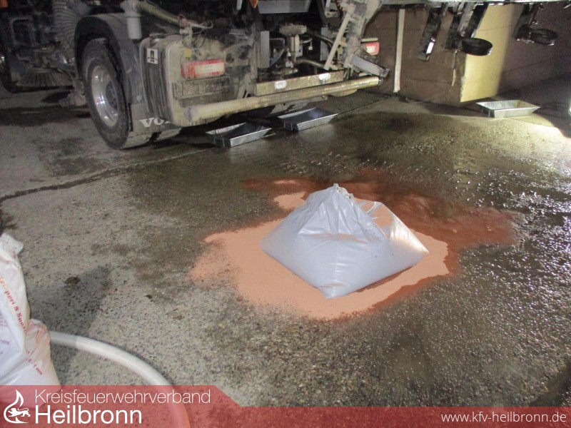 Nachdem die Kräfte wieder eingerückt waren, fiel einem Feuerwehrangehörigen eine größere Ölspur vor dem Feuerwehrhaus auf. Das Abfahren dieser ergab eine abgestellte LKW-Kehrsaugmaschine, aus der Hydrauliköl in größeren Mengen in einen Abwasserschacht floss. Der Fahrer hatte dies offenbar nicht bemerkt und bereits Feierabend gemacht. Erneut wurden die Feuerwehrangehörigen alarmiert um das Einfließen des Öls in den Schacht zu stoppen und die Restmengen aufzufangen. In Absprache mit dem hinzugerufenen Klärwärter, wurde unter Berücksichtigung entsprechender Sicherheitsmaßnahmen in mehreren Schächten das Öl aufgefangen und abgeschöpft sowie die Kanalisation gespült. Die Reinigung der Ölspur konnte die betroffene Firma selbst übernehmen. Einsatzende war gegen 00:40 Uhr.