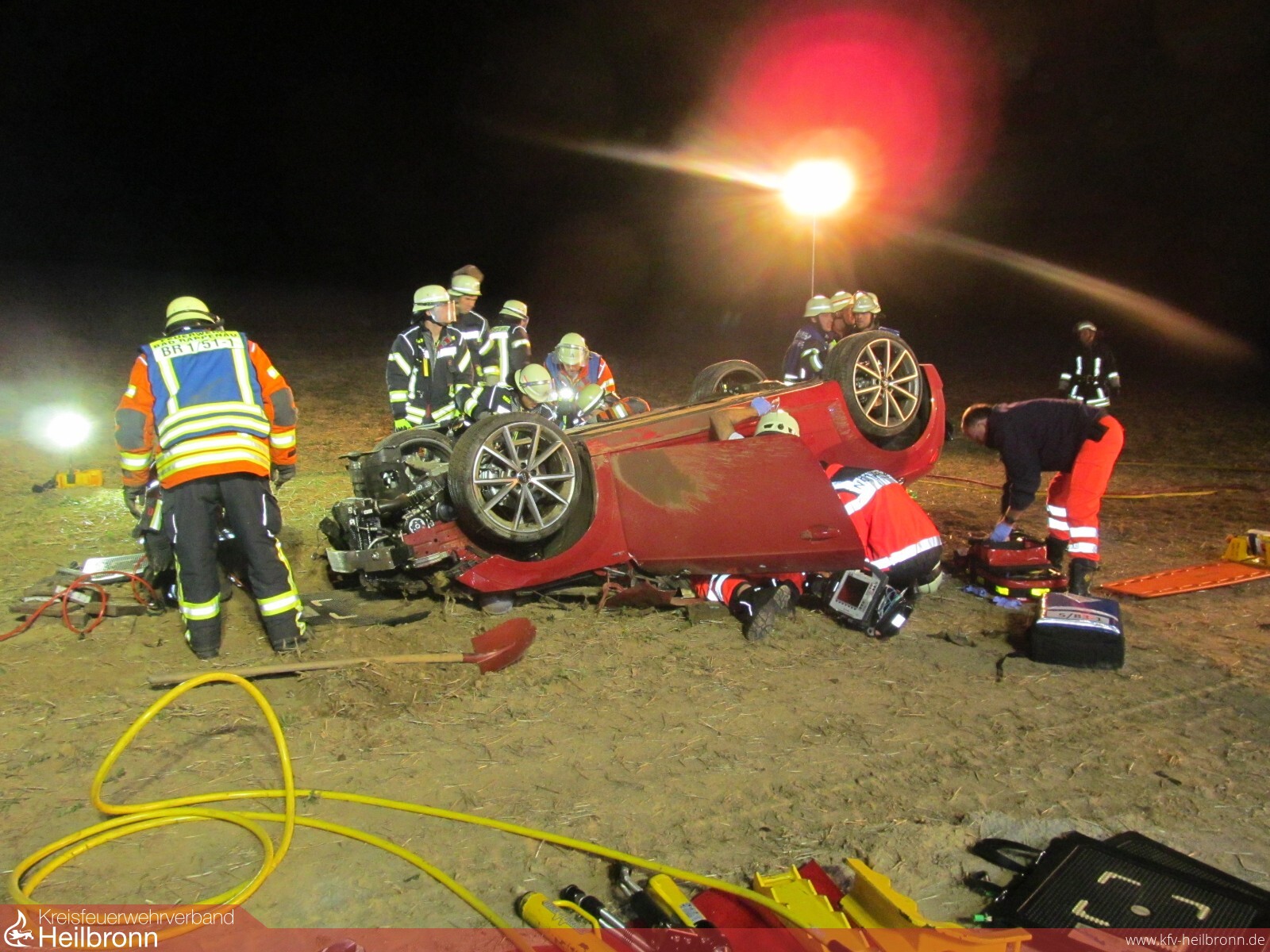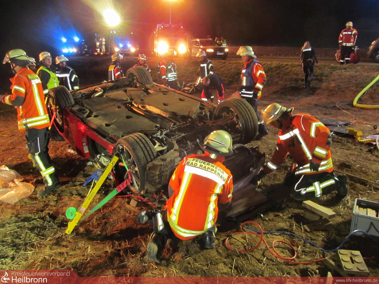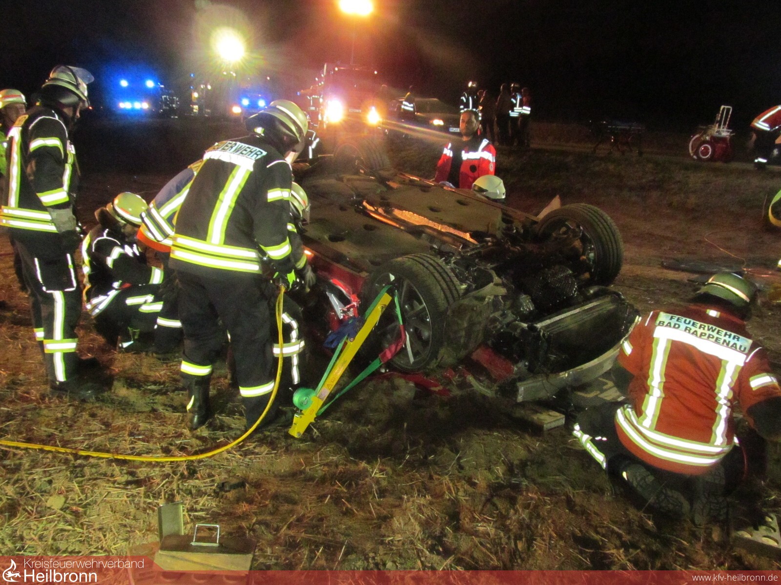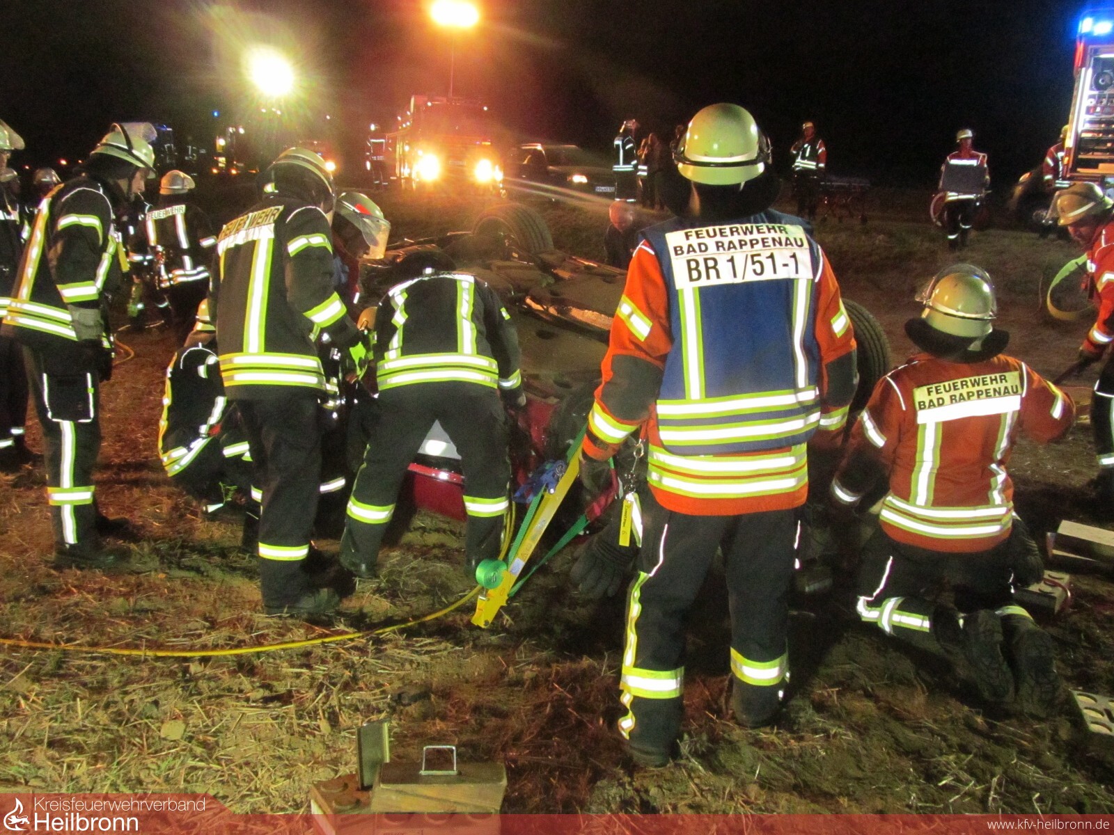 Mit dem Alarmstichwort „Verkehrsunfall PKW“ wurden die Freiwilligen Feuerwehren Bad Rappenau und Siegelsbach auf die K2043 alarmiert. Ein 20-Jähriger fuhr mit seinem Audi zwischen Siegelsbach und Babstadt, als der Wagen nach rechts von der Straße abkam, über einen Gemeindeverbindungsweg schanzte, nach 20 Meter mit der Front in einem Acker einschlug und nach weiteren 30 Meter auf dem Dach liegen blieb. Der junge Mann erlitt hierbei schwere, seine 15-jährige Beifahrerin leichte Verletzungen. Beim Eintreffen der Feuerwehr wurde die Beifahrerin bereits von Ersthelfern betreut, der Fahrer befand sich noch im verunfallten Fahrzeug. Die Feuerwehr stabilisierte den PKW, stellte den Brandschutz sicher und befreite den 20-Jährigen mithilfe von hydraulischem Rettungsgerät unter enger Absprache mit dem Rettungsdienst. Die Freiwillige Feuerwehr Bad Rappenau war mit 3 Fahrzeugen und 15 Mann im Einsatz.