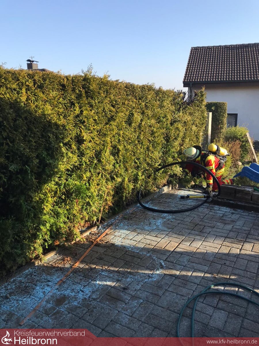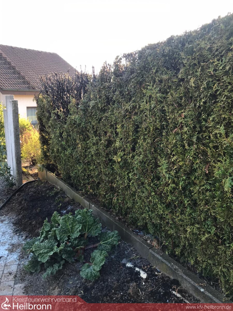 Durch die schnelle Reaktion einiger Anwohner und Nachbarn war die Hecke, die auf etwa 3 Metern Breite brannte, größtenteils mit Wasser und einem Feuerlöscher abgelöscht worden. Die restlichen Löscharbeiten und hauptsächlich Nachlöscharbeiten wurde durch einen Trupp unter Atemschutz vom Tanklöschfahrzeug durchgeführt.