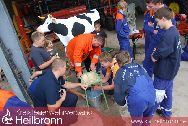 14 Mannschaften, gebildet aus den Jugendfeuerwehren des Kreis Heilbronn, haben sich bei der Jugendfeuerwehr Beilstein zur Stadtrallye anlässlich des 10 ten Grün-dungsjahres der Beilsteiner Jugendfeuerwehr angemeldet. Nach einer festgelegten Reihenfolge haben sich die Jungs und Mädchen in ihren blauen Feuerwehruniformen auf den von Matthias Bernet vorbereiteten Rundweg durch Beilstein gemacht. Unterbrochen wurde der 3,5 km lange Weg immer wieder durch Aufgabenstationen an markanten Beilstein Orten, wie z.B. beim Bauernhof Siegele mit einem Kuhmelkwettbewerb an einer Kuhattrappe (Bild 1).