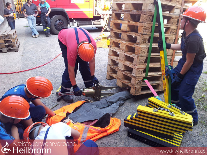 Der erste Einsatz ließ nicht lange auf sich warten, eine Person war unter einem umgestürzten Palettenstapel eingeklemmt worden. Darauf hin wurde die erste Gruppe alarmiert, welche nach wenigen Minuten an der Einsatzstelle eintraf. Nachdem die restlichen Paletten gegen umstürzen abgesichert waren, mussten mit Hilfe der hydraulischen Rettungsschere mehrere fingerdicke Eisenstäbe durchtrennt werden, welche zwischen den Paletten verkanntet waren. Nun konnten die auf der Person liegenden Paletten entfernt werden, was jedoch ein neues Problem zu Tage brachte: der Fuß der Person war unter einem großen Pallettenstapel eingeklemmt. Dieser wurde mit hydraulischem Gerät angehoben, die Person befreit und anschließend dem Rettungsdienst übergeben.