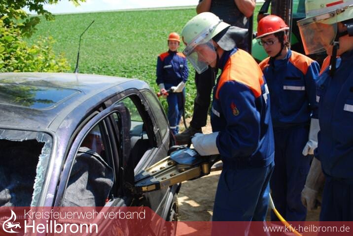 Auch die Mittagspause verlief ruhig, so dass auch noch Zeit zur Entspannung blieb. Erst am späten Nachmittag kam der nächste Alarm, Verkehrsunfall auf einem Feldweg in der Nähe des Wasserturms. Ein PKW war in einer unübersichtlichen Kurve mit einem Traktor zusammengeprallt. Die drei PKW-Insassen waren in ihrem Fahrzeug eingeklemmt. Der Traktorfahrer und sein Begleiter wurden beim Zusammenstoß von ihrem Fahrzeug geschleudert und lagen verletzt auf der Straße. Nachdem zunächst diese beiden Personen versorgt und aus dem Gefahrenbereicht gebracht waren, konnte mit der Rettung der PKW-Insassen begonnen werden. Dazu mussten mit dem Spreizer die Fahrer- und Beifahrertüre geöffnet werden. Um die Personen dann auch noch sicher aus dem Unfallwagen holen zu können, musste schließlich auch noch das Fahrzeugdach entfernt werden.