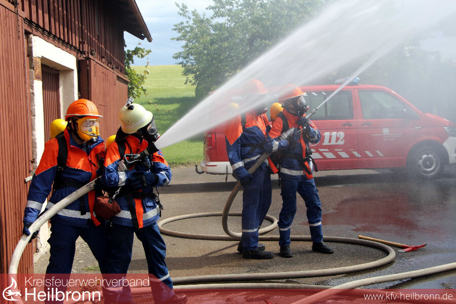 Doch nur kurze Zeit später mussten die jungen Einsatzkräfte bereits schon wieder zu einem Großeinsatz ausrücken. „Brand eines landwirtschaftlichen Anwesens in Biberach“, lautete die Durchsage des Leitstellendisponenten. Der komplette Löschzug war gefragt. Mit einem massiv vorgetragenen Löschangriff waren die Flammen schnell unter Kontrolle zu bringen. Mehrere Atemschutztrupps konnten die vermissten Personen im Gebäude schnell ausfindig machen und ins Freie retten. Durch gezieltes Errichten einer Riegelstellung gelang es auch das angrenzende Wohnhaus zu halten. Nach gut einer Stunde konnte der Einsatzleiter dann „Brand aus“ an die Feuerwehrleitstelle zurückmelden.