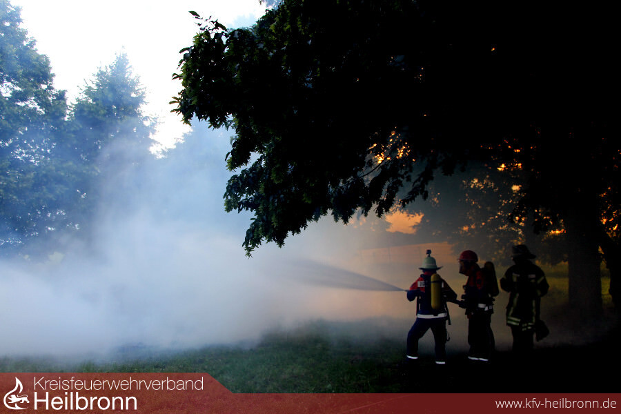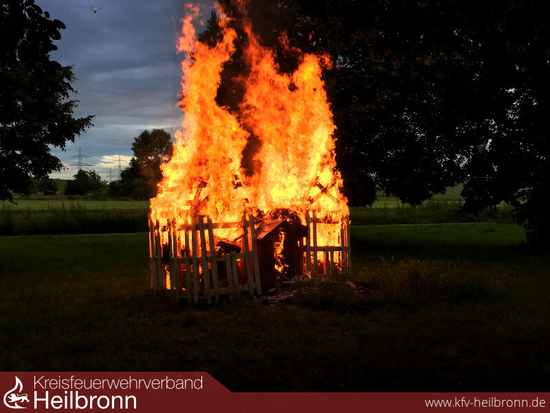 Vor Ort angekommen war schnell klar, dass für das in voller Ausdehnung brennende Gartenhaus nicht mehr viel getan werden konnte. Sofort wurden Löschmaßnahmen eingeleitet und die umliegenden Gebäude durch die Vornahme weiterer Löschrohre geschützt.