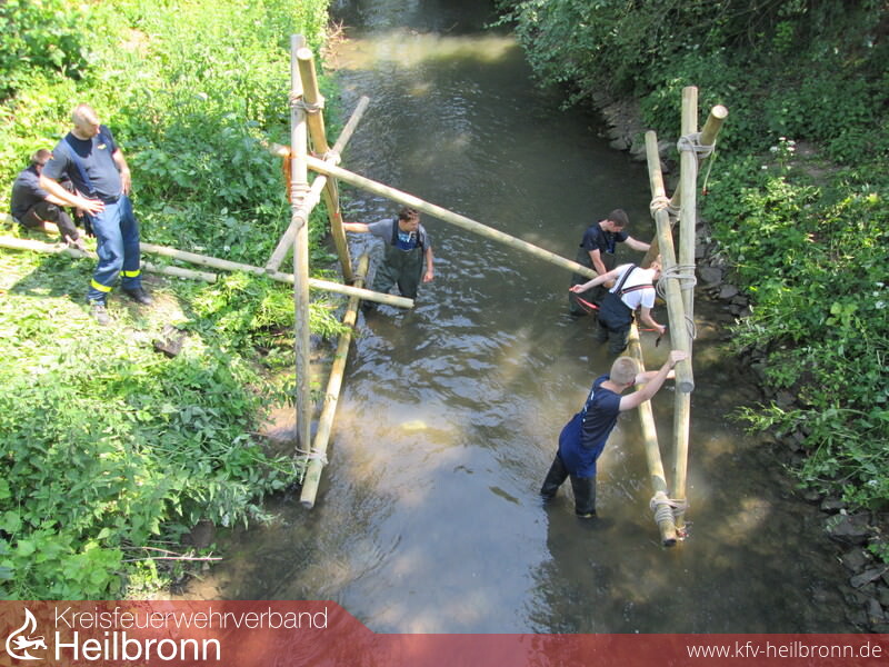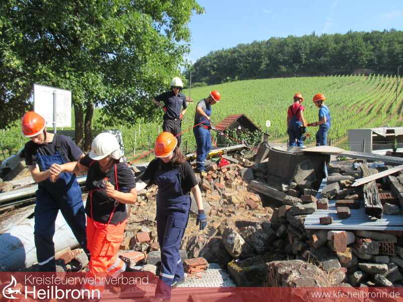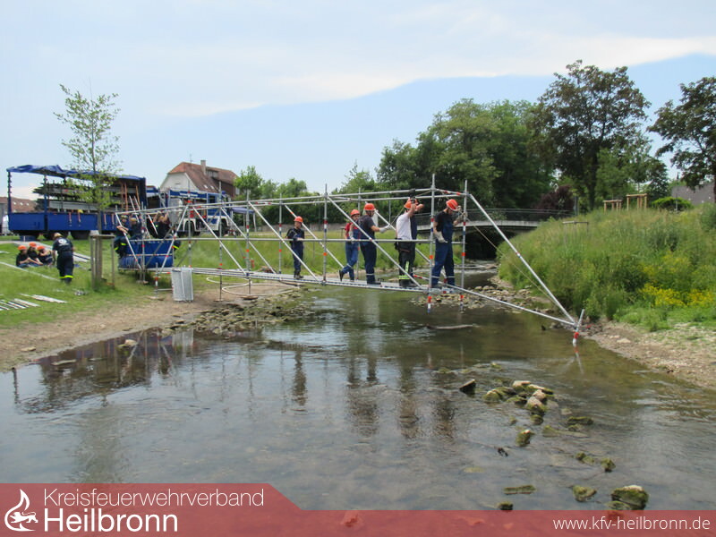 Nach dem Frühstück am Samstagmorgen wurden die Jugendlichen in Gruppen aufgeteilt und fuhren dann gemeinsam zu den im Stadtgebiet sowie in Heilbronn verteilten Stationen. Hierbei hat das THW aus Heilbronn einen Steg aus Gerüstmaterial über die Zabermündung gebaut. Das THW aus Weinsberg hat mit der traditionellen Variante aus Rundhölzern, Dielen und Seilen eine Brücke über die Zaber gestellt. Mit der Höhenrettungsgruppe der Berufsfeuerwehr Heilbronn konnten die Jugendlichen nach einem theoretischen Teil das Abseilen vom Übungsturm in Lauffen selbst durchführen. Auf dem Übungsgelände der Rettungshundestaffel Unterland in Heilbronn durften die Jugendlichen nach einer erst eigenständigen aber sehr schwierigen Personensuche, die Möglichkeiten und Vorteile mit Hilfe deren Hunde kennenlernen. Hiermit war das Aufsuchen einer Person im unterirdischen Röhrensystem kein Problem mehr. Die Rettung der Person musste dann in Teamarbeit mit Material der Feuerwehr durchgeführt werden. Alle vier Stationen wurden von den Jugendlichen selbst und nur mit Unterstützung der jeweiligen Hilfsorganisation durchgeführt. Nach der Stärkung mit einem Abendessen konnte man den Abend wieder am Lagerfeuer ausklingen lassen.