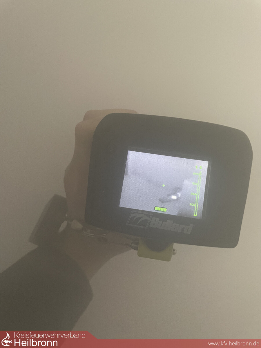 An der zweiten Station wurde ein Raum künstlich eingenebelt, in dem mithilfe der Wärmebildkamera nach vermissten Personen gesucht werden durfte. Zum Schutz vor Rauchgasen hatten die Kinder sich mit „Atemschutz“ (Attrappen) ausgerüstet. Die „gerettete“ Übungspuppe wurde im Anschluss mit einer Trage ins Freie transportiert.