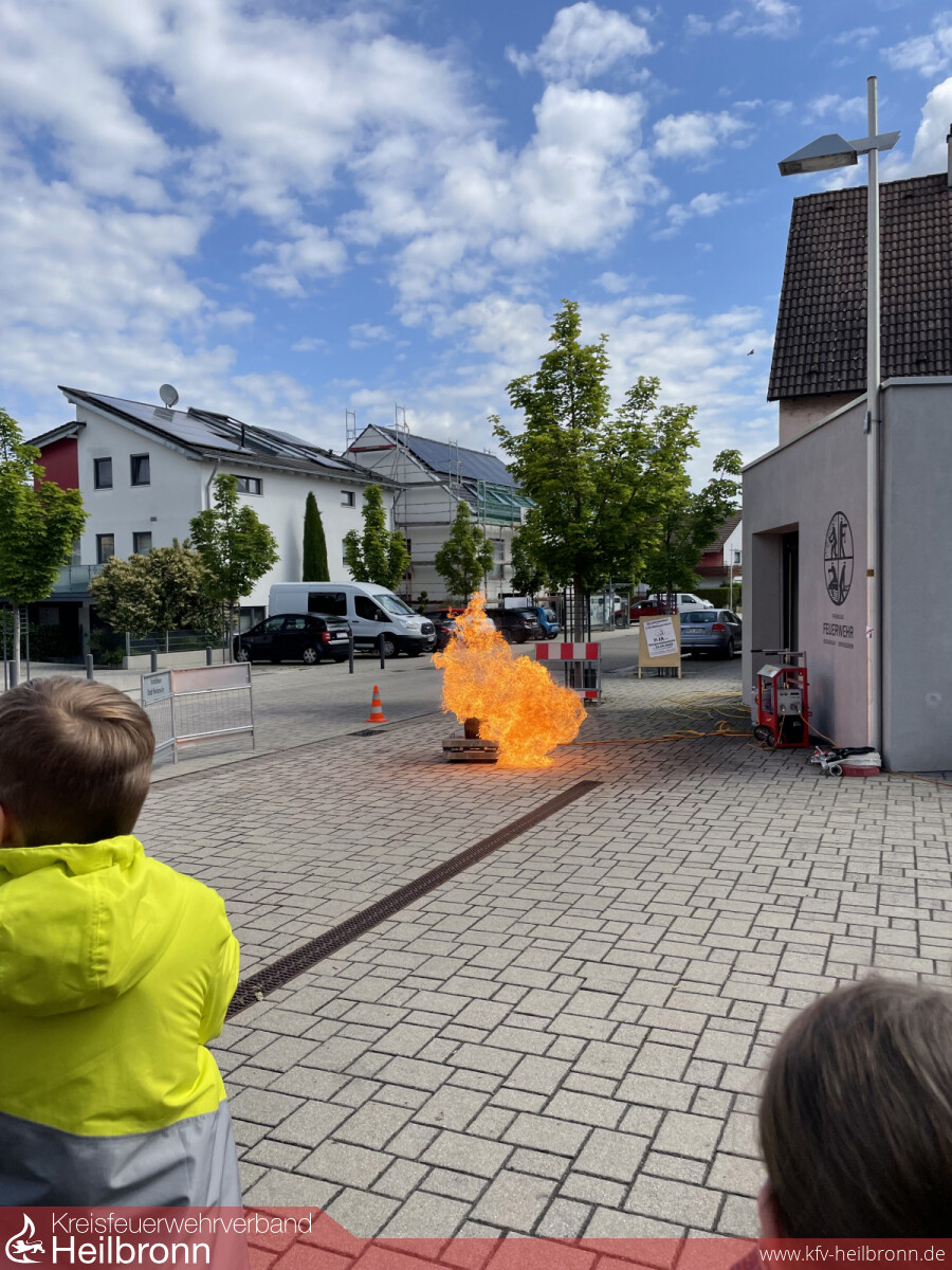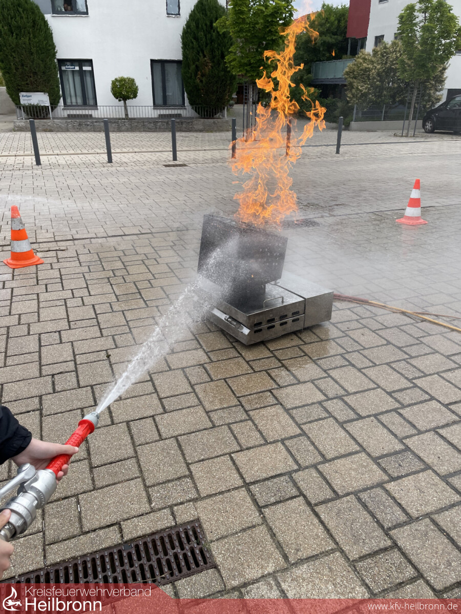 An der ersten Station wurde ein Löschangriff durchgeführt. Mittels FireTrainer (gasbetriebenes Brandsimulations- und Übungsgerät) wurde ein echtes Feuer erzeugt, welches die Kinder löschen durften.