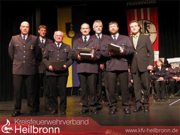 Die scheidende Führungsspitze der Jugendfeuerwehr Baden-Württemberg (v.l.n.r.) der stellv. Landesjugendfeuerwehrwart Markus Hees, Präsident des Landesfeuerwehrverbandes Dr. Frank Knödler, Innenminister Dr. Thomas Schäuble, der stellv. Landesjugendfeuerwehrwart Oliver Marzian, Oberbürgermeister Michael Schulz