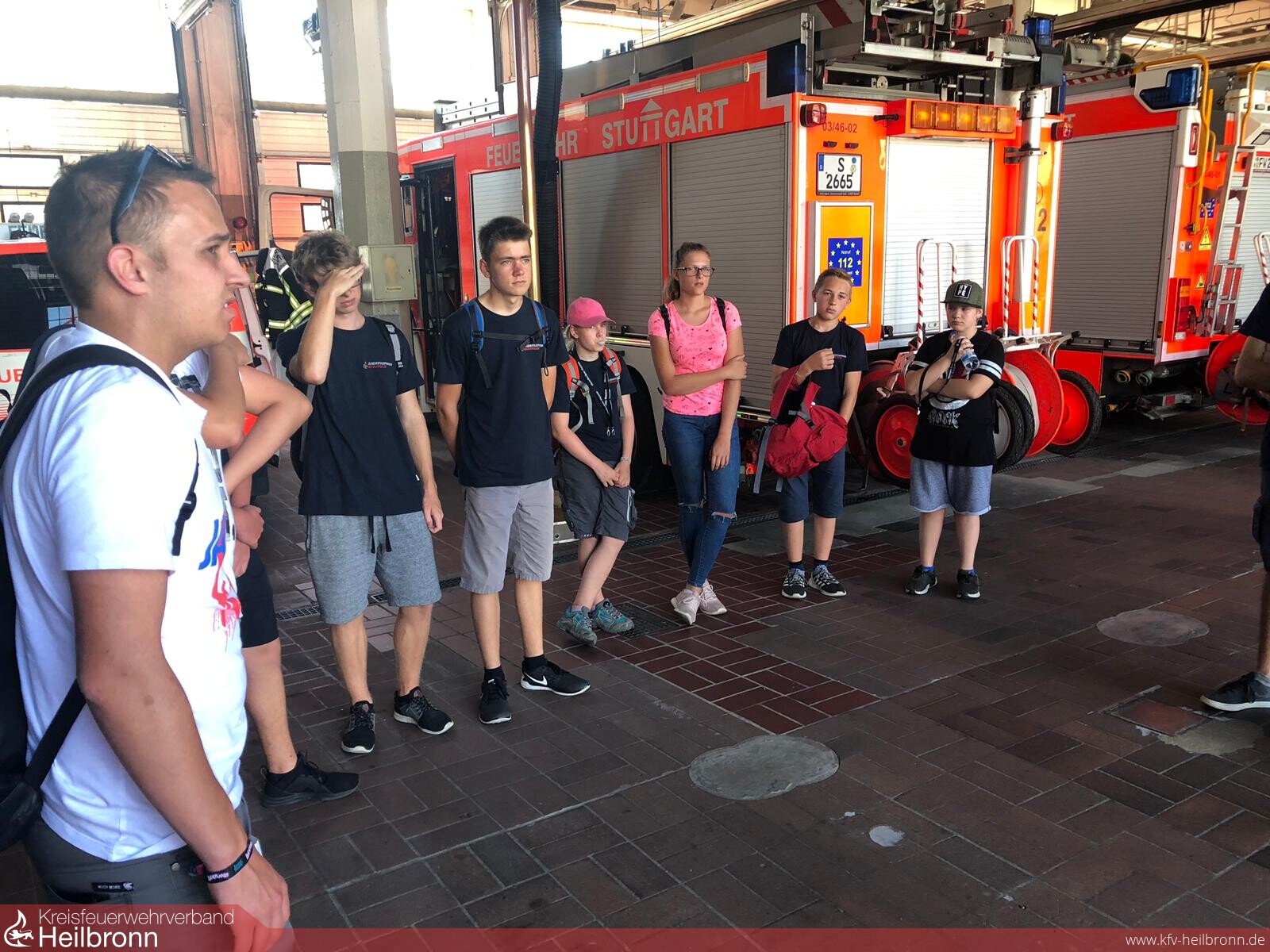Auf der Strecke zurück zum Bahnhof lag aber nun das ersehnte Ausflugsziel, die Feuerwache 3, Bad Cannstatt. Auf diesem Gelände liegt nämlich die „Leitstelle für Sicherheit und Mobilität Stuttgart“. Deren Leiter, Fabian Müller, ist selbst Mitglied bei der Freiweilligen Feuerwehr Neckarsulm und ermöglichte die ausführliche Besichtigung der Leitstelle. Er erklärte einige interessante Fakten: „Hier in Stuttgart arbeiten wir mit dem sogenannten SSV-Prinzip. Die Freiwillige Feuerwehr kommt in Stuttgart dann zum Einsatz, wenn sie schneller als die Berufsfeuerwehr vor Ort ist, Sonderaufgaben einnimmt oder Verstärkung erforderlich ist.“ So erfuhren die Jugendfeuerwehr-Mitglieder, dass es in Großstädten ebenso wie überall anders Freiwillige Feuerwehren gibt. Aus der Integrierten Leitstelle werden nicht nur die täglich rund 680 Anrufe für Feuerwehr und Rettungsdienst entgegengenommen und koordiniert, sondern die Integrierte Verkehrsleitzentrale steuert und überwacht auch das gesamte U- und S-Bahn Netz in Stuttgart aus demselben Gebäude. So ist ein optimaler und schneller Austausch im Falle eines Notfalls gewährleistet. Im Anschluss ging es noch in die Fahrzeughalle, wo es einige Sonderfahrzeuge zu sehen gab. So sind in Bad Cannstatt zum Beispiel der durch seine Vielseitigkeit beeindruckende Rüstwagen-StraßeSchiene-Tunnel, der Feuerwehrkran, der Einsatzleitwagen 2, sowie die Feuerwehr-Taucher stationiert. Die unterschiedlich alten Fahrzeuge wurden begutachtet und auf ihre Unterschiede, sowie die Vor- und Nachteile der modernen und teilweise anfälligen Technik untersucht. Als ob es nicht aufregend genug gewesen wäre, musste das meist alarmierte HilfeleistungsLöschgruppenfahrzeug im gesamten Stadtgebiet während der Fahrzeugbesichtigung zu einem Einsatz ausrücken. Nach diesem langen, spannenden und heißen Tag, ging es mit einem vom Jugendfeuerwehrwart spendierten Eis zurück nach Neckarsulm. Die Jugendlichen und ihre Betreuer hatten einen spannenden Tag in Stuttgart, bei dem sie viel über die Einsatztaktiken einer Berufsfeuerwehr und deren vielseitiges Aufgabenspektrum erfahren konnten. An dieser Stelle nochmals vielen Dank an Fabian Müller und Thomas Oeckler für die interessanten Führungen.