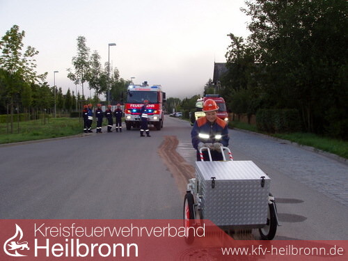 Containerbrand. Das war das nächste Stichwort mit dem die Jugendlichen aus ihren Betten gerufen wurden. Es war 0.30 Uhr – mitten in der Nacht. Diesmal waren TLF und das LF 8 im Einsatz. In der Kläranlage stand ein Container bereits in Flammen. Dieser wurde durch einen Schaumteppich gelöscht. Bereits eine halbe Stunde später kam ein erneuter Anruf, in dem ein Passant meldete, dass in Ruchsen im Gewann „Seeklinge“ ein Baum über der Straße liegen würde. Sofort rückten die verbliebenen Einsatzkräfte mit VRW und dem RW aus. Sie beseitigten den Baum rasch, indem sie diesen mit Hilfe von Handsägen zersägten und dann an den Fahrbahnrand bringen konnten. Zügig war auch dieser Einsatz beendet.