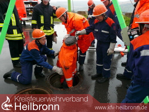 Dann begann der 1. Berufsfeuerwehrtag mit der Einweisung in die Fahrzeuge. Bereits um 10.00 Uhr wurde die 1. Alarmierung ausgelöst. „Wasserschaden im Keller“ war das Stichwort. Dieser befand sich in der Hauptstraße 16 in Möckmühl bei Familie Boos. Die Jugendlichen, die auf das Löschfahrzeug (LF 8) eingeteilt waren, mussten sich nun ausrüsten und das Fahrzeug besetzen. In dem Keller stand ca. 5 cm Wasser hoch, welches mit dem Wassersauger abgepumpt wurde. Die zurückgebliebene Mannschaft beschäftigte sich derweil mit Fußballspielen. „Person im Schacht“ war der nächste Einsatz, der um 10.20 Uhr in der Funkzentrale einging. Die nächsten Fahrzeuge, Vorrausrüstwagen (VRW), Rüstwagen (RW), Tanklöschfahrzeug (TLF) und Einsatzleitwagen (ELW) rückten sofort zur Personenrettung aus. Die Person wurde mit einem Dreibock und weiterem Rettungsgeschirr aus dem Schacht befreit.