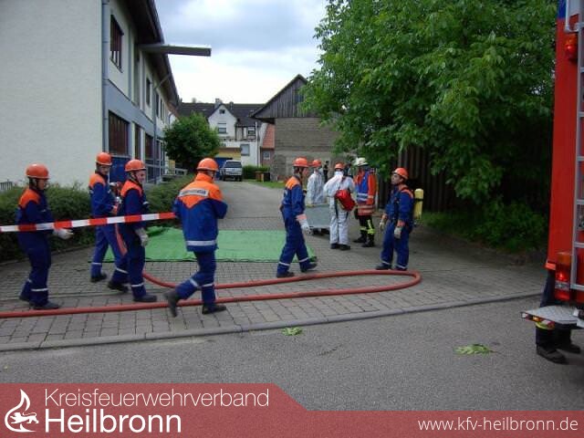 Nach einem ausgiebigen Frühstück fuhr man zum Fußballspielen auf den Sportplatz. Unterbrochen wurde ein spannendes Spiel um 10.17 Uhr von einem Gefahrstoffeinsatz bei der Schreinerei Frauhammer in Herbolzheim. Nachdem in der Schreinerei ein gefährlicher Stoff ausgelaufen war, fand der Inhaber der Schreinerei gerade noch den Weg nach draußen, ein Mitarbeiter wurde allerdings vermisst. Schnell wurden die notwenigen Maßnahmen eingeleitet und die vermisste Person konnte durch den Angriffstrupp des Herbolzheimer LF gerettet werden. Nachdem die Fahrzeuge im Feuerwehrmagazin wieder aufgerüstet wurden, rückte man zu 2 weiteren Folgeeinsätze aus. Im Bauhof musste eine Person unter einem Container befreit werden. Auslaufender Kraftstoff wurde im Hof der Firma Söhner in Neudenau aufgenommen und das Leck an 2 Heizöl-Laster abgedichtet. Nach einem gemeinsamen Mittagessen, welches durch die Freundin eines Ausbilders zubereitet wurde, rückten wir nochmals zu einem Flächenbrand nahe dem Schlossturm in Herbolzheim aus. Mit dem dringend erforderlichen Magazindienst endete die 20-Stunden-Übung.