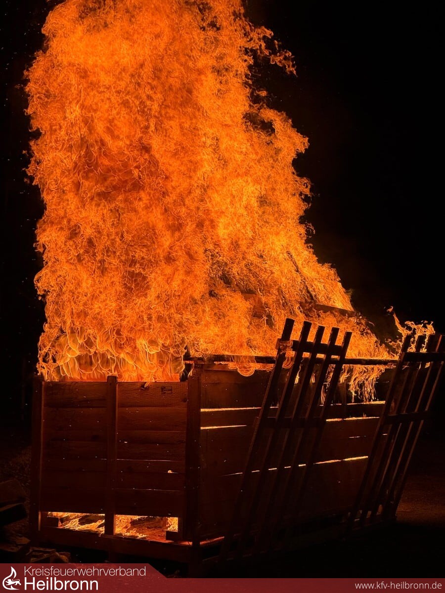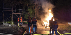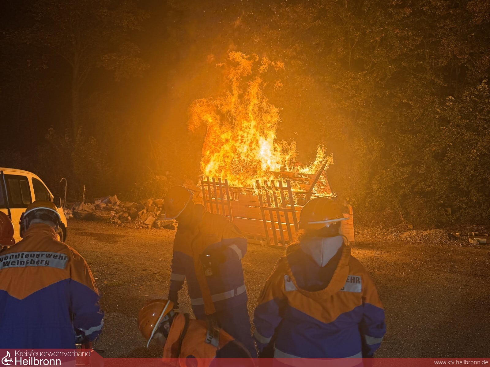 Zum Abschluss des Tages schauten die Jugendlichen gemeinsam die Feuerwehrdokumentation „Feuer & Flamme“, bevor gegen 21:30 Uhr der letzte Übungseinsatz des Tages folgte. In einer fiktiven Schrebergartenanlage brannten zwei selbstgebaute Hütten, die durch das schnelle Eingreifen der Jugendfeuerwehr gelöscht werden konnten.