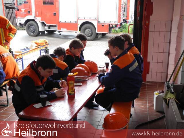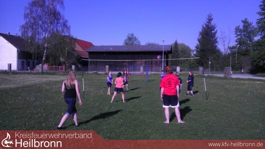 Die Jugendlichen und ihrer Betreuer trafen sich in den Feuerwehrhäusern der jeweiligen Abteilungswehren. Als erstes Stand die Schichteinteilung auf dem Programm. Hier wurden die Jugendlichen auf die jeweiligen Fahrzeuge eingeteilt, so dass im Einsatzfall das Fahrzeug sofort ausrücken konnte, das benötigt wurde. Gerätekunde war somit das Erste, was den Jugendfeuerwehrmitgliedern angeboten wurde. In Treschklingen wurde eigens eine Leitstelle eingerichtet die auch durch Jugendliche besetzt war. Die Leitstelle forderte im Einsatzfall bei den anderen Abteilungen Verstärkung nach. Hier übten die Jfw-Kameraden auch stets die 5 W-Fragen, die auch für die Abnahme der Jugendflamme 1 benötigt werden. Im Einsatzfall erklang im Gerätehaus ein Gong (über ein extra eingerichtetes Lautsprechersystem), dann wurde angesagt was anliegt und wer ausrückt. In Treschklingen war auch die Jugendgruppe Babstadt mit untergebracht. Beide Ortsteile betreiben ohnehin gemeinsam die Jugendarbeit. Als erste gemeinschaftliche Veranstaltung trafen sich alle Jugendgruppen ab 17:00 Uhr auf dem Sportplatz in Grombach zum Dienstsport. (Volleyball + Fußball). Gegen 19:00 Uhr machten sich die Jugendgruppen wieder auf den Rückweg in die jeweiligen Ortsteile. Wieder angekommen in Fürfeld richtete sich die dortige Jugendgruppe in der Sporthalle das vorübergehende Magazin und Nachtquartier ein. Mit Einsatzzentrale, Schlafmöglichkeiten, Küche und Sanitärenanlagen war das die perfekte Übernachtungsmöglichkeit. Parallel zur Einrichtung der Sporthalle wurde das Abendessen gekocht.