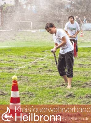 Wasser ist ein gutes Stichwort. Das spielt gleich eine große Rolle. Auf dem Festplatz unweit des Feuerwehrgerätehauses sind zwei Autos geparkt und ein Parcour aufgebaut. Kurz darauf hat die 14-jährige Imogen ein Feuerwehrschlauch in der Hand und spritzt andere ab. \"Das gibt Rache\", ruft die zehnjährige Lara, die bereits pitschnass ist. Währenddessen bestreiten zwei Teams einen Wettkampf. Feuerwehrmann Florian Schmidt erklärt die Regeln: Mit einem mit Wasser gefüllten Eimer müssen sie den Parcour durchlaufen und das Wasser in bereitstehende Kübelspritzen füllen. Ist die voll genug, soll der Tennisball, der auf der Spitze einer Pylone tront, abgespritzt werden. \"Dafür müsst ihr feste pumpen\", erklärt Schmidt und zeigt dann den Eimer, ein zusammenfaltbares Stoffgefäß. \"Das ist ja kein Eimer, das ist eine Laterne\", ruft Martin.