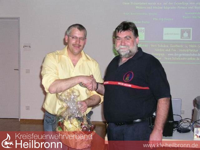Als kleines „Dankeschön“ für die eindrucksvolle Präsentation und den Bemühungen von Dirk Schulze (links) das schwierige Thema jugendgerecht darzustellen überreichte ihm Jugendfeuerwehrwart Bernhard Brückner (rechts) zum Abschluss einen Geschenkkorb.