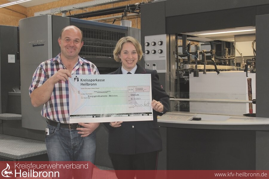 Über eine Spende in Höhe von 1000 Euro kann sich die Kreisjugendfeuerwehr Heilbronn freuen. Katrin Semen, Kreisjugendfeuerwehrwartin, konnte den Scheck im Neubau der Druckerei Schweikert in Obersulm-Eschenau entgegennehmen.