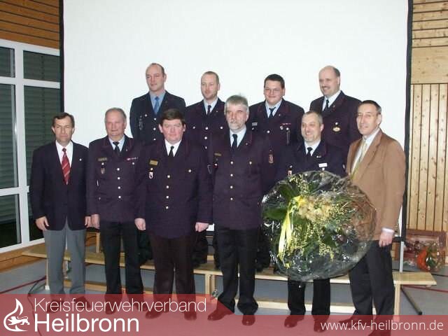vordere Reihe v.l.n.r.: Bürgermeister Peter Dolderer, Vorsitzender des Kreisfeuerwehrverbandes Heilbronn Reinhold Korb, stellvertretender Landesjugendfeuerwehrwart Andreas Rudlof, Kreisbrandmeister Hans-Wilhelm Hansmann, Wolfgang Hagner (beide Ehrennadel der Deutschen Jugendfeuerwehr in Silber) und Landrat Klaus Czernuska.