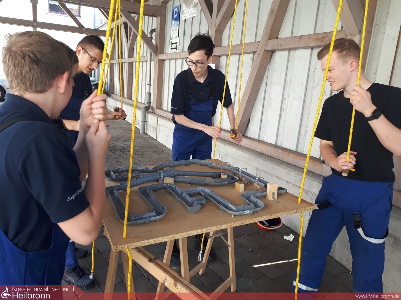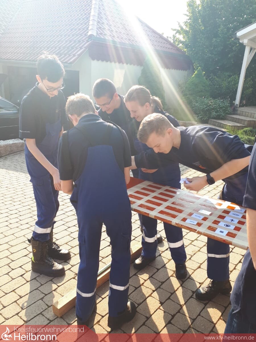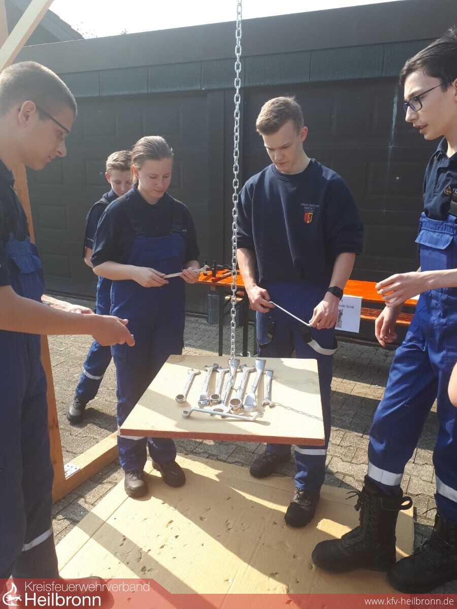 Hoch Motiviert starteten die beiden Gruppen mit ihren Gruppenleitern Manuela Moser und Rinaldo Dirl zu ihren ersten Stationen. Die erste Station beinhaltete ein Auto Quiz, in dem die Jugendlichen einiges über das Herkunftsland der Automarken wissen mussten. An der nächsten Anlaufstelle mussten unsere Helden verschieden Gegenstände an einem Gitter hochführen. Weiter ging es nun zur nächsten Prüfung, hier wurde ein Pendel gebaut und die Teilnehmer mussten es mit Werkzeug so beladen, dass es im Gleichgewicht blieb. An Station vier überraschte unsere Jugend eine Fußschleuder, mit der ein Tennisball geschleudert werden musste, um eine Klappe zu treffen. Erfolgreich startete die Gruppe zur nächsten Herausforderung, sie hieß Seifen Curling, hierbei musste Seife auf einem rutschigen Untergrund mit Geschick in einen schwarzen Ring gezielt werden. Nach dieser rutschigen Aufgabe ging es zur einen Hindernislauf, hier war Teamgeist gefragt, da die Teilnehmer alle in einer Leiter laufen mussten. Nach der sportlichen Verausgabung, musste unsere Jugendfeuerwehr eine ruhige Hand beweisen. Mithilfe eines Bleistiftes bauten die Jugendlichen ein Turm aus Schraubenmuttern zusammen.