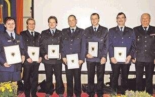 Bild: 40 Jahre Jugendfeuerwehr in Bad Wimpfen. Das Foto zeigt alle bisherigen Jugendleiter: (von links nach rechts) Christiane Fuchs, Sascha Kohler, Martin Schihwetz, Peter Ullrich, Martin Ramsperger, Winfried Schnell und Reinhold Korb, der erste Jugendleiter und heutige Kommandant. (Foto: Thorwartl)