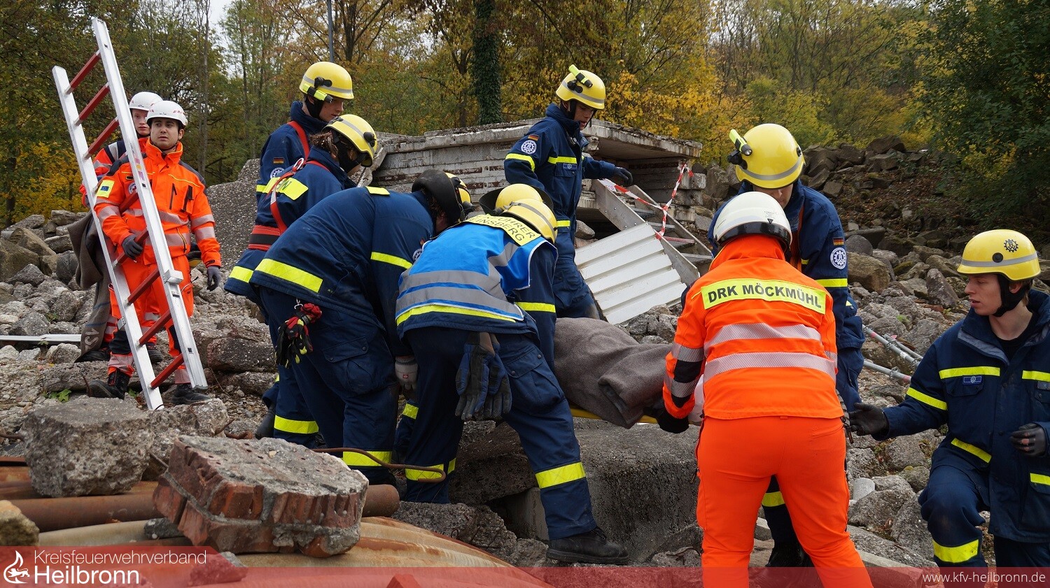 Die teils „schwerverletzten“ Personen konnten nur mühsam aus ihrer misslichen Lage befreit werden. So mussten manch Verletzter mit einem Sicherungs- und Rettungssytem aus den Trümmerteilen gezogen werden. Anschließend wurden diese Personen in einem Schleifkorb liegend über den Trümmerkegel zu den DRK-Kräften gebracht. Teamarbeit war in dieser Situation absolut gefragt, da der Schleifkorb wegen der Stolpergefahr nicht über die Trümmer getragen werden kann, sondern in einer Personenkette immer weitergegeben werden musste.
