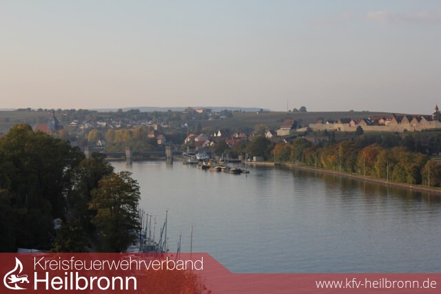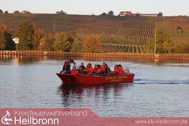 Wieder in Lauffen angekommen, warteten bereits einige Kameraden mit dem Mehrzweckboot und der Drehleiter am Oberwasser der Neckarschleuse Lauffen. Mit Schwimmwesten ausgestattet, ging es dann an einem sonnigen herbstlichen Nachmittag mit dem Boot auf dem Neckar, entlang durch bereits bunt gefärbte Weinberge, vorbei am Kernkraftwerk in Richtung Kirchheim. Zeitgleich konnte eine weitere Gruppe die Lauffener Drehleiter testen und auch hier die Aussicht auf die Stadt und die Weinberge von oben genießen - die Feuerwehr der Stadt Meuselwitz verfügt, wie auch die Feuerwehr Lauffen über eine Drehleiter mit Gelenkteil, jedoch ist das Meuselwitzer Gelenkteil nicht teleskopierbar - .