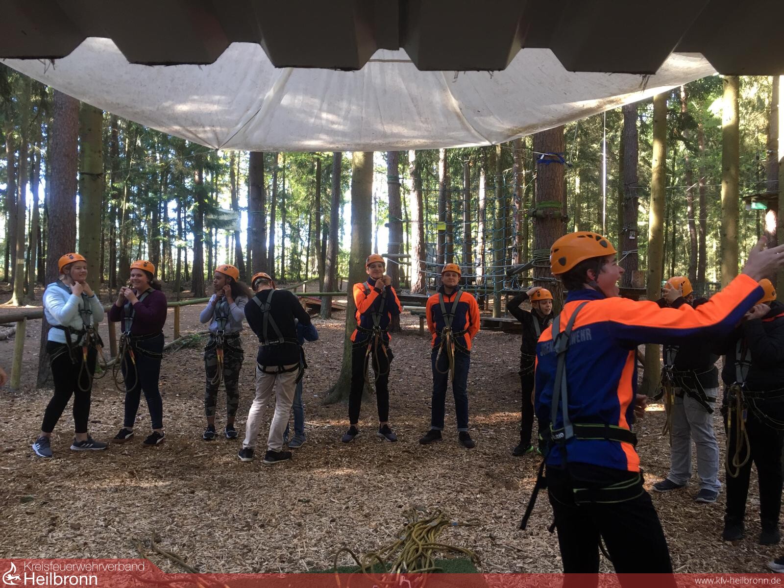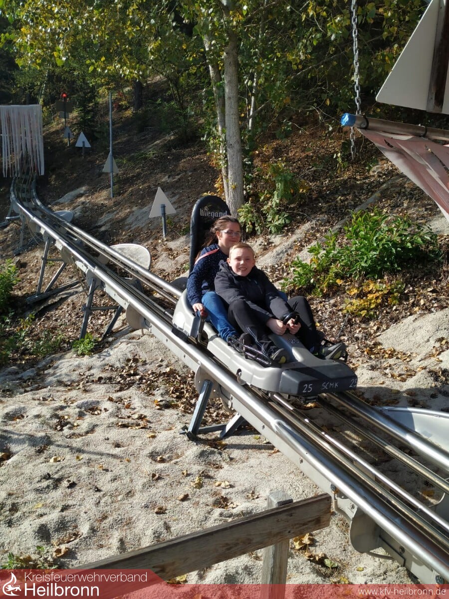 Abfahrt war noch vor Sonnenaufgang um sieben Uhr am Gerätehaus in Gemmingen mit dem Bus. Entsprechend groß war die Müdigkeit der 18 Jugendlichen, jedoch legte sich diese ziemlich zügig. Nach einer kleinen Stärkung auf einem Rastplatz bei Wurst, Brezel und Getränk wurde der Freizeitpark gegen elf Uhr erreicht, wo zuerst der Waldklettergarten in Angriff genommen wurde. In mehreren Gruppen meisterten die Jugendlichen die unterschiedlich schweren Parcours und wuchsen über sich hinaus. Teamarbeit war dabei oberstes Gebot, doch auch die gute Laune kam dabei nicht zu kurz, da jede Menge miteinander gelacht wurde.