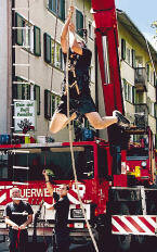 Bild 1: Nicht nur bei einem Feuer: Die Jugendfeuerwehr weiß sich auch in heißen Spielen unterm Basketballkorb zu behaupten.Bild 2: Fitnesstest am Feuerwehrkran: Wer den Korb erreicht, erhält eine Belohnung. (Fotos: Guido Sawatzki)