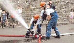 Bild: Mit einer Schauübung, bei der es richtig nass wurde, machte die Hardthausener Jugendfeuerwehr Werbung für Nachwuchs im Ortsteil Gochsen. (Foto: Agentur Kochertal)