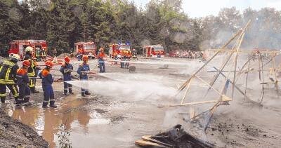Moderator Hinter der Absperrung verfolgen mehr als 100 Zuschauer die Großübung. Moderator Heribert Danner, stellvertretender Feuerwehrkommandant aus Talheim, sagt: \"Die Jugendlichen wollen zeigen, was sie können.\" Die Zusammenarbeit mit anderen Wehren bedeutet eine Herausforderung. Gegen 13.50 Uhr entzünden Feuerwehrleute das Holzgerippe und kleine Feuerstellen. Zehn Minuten später geht der Alarm raus.