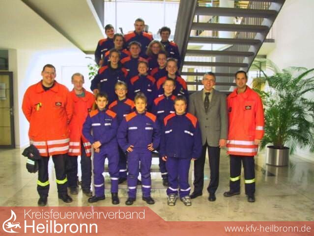 Das Bild zeigt die Angehörigen der Jugendfeuerwehr Bad Rappenau mit ihren Betreuern (v.l.n.r.) Ralf Schneider und Harald Last sowie dem stellvertretenden Landesjugendfeuerwehrwart Markus Hees und Oberbürgermeister Hans Heribert Blättgen (v.r.n.l.) im Foyer des Rathauses der Stadt Bad Rappenau.