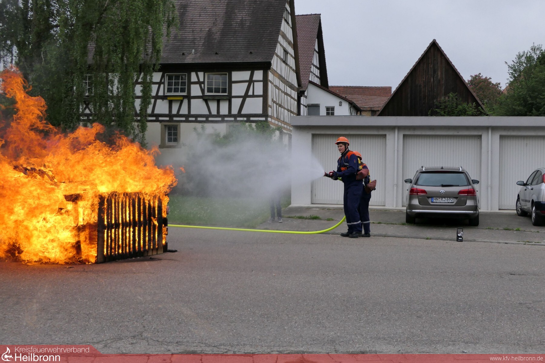 Anlässlich des Dorfplatzfestes der Feuerwehr Gemmingen, Abteilung Stebbach zeigte die Jugendfeuerwehr am Nachmittag des 10. Mai 2018 eine Schauübung vor dem Feuerwehrhaus. Unzählige Zuschauer warteten gespannt darauf bis das Löschgruppenfahrzeug mit Blaulicht und Martinshorn angefahren kam, um das brennende Haus zu löschen. Mit Atemschutzgerät, Handlampe und Leinenbeutel ausgerüstet begann der Angriffstrupp Schläuche auszurollen und das 1. Rohr aufzubauen. Gleichzeitig erfolgte der Aufbau der Wasserversorgung vom Hydrant über Fahrzeugpumpe bis zum Verteiler durch den Wassertrupp. Nachdem die Brandbekämpfung durch den Angriffstruppe begonnen hatte, rüstete sich der Wassertrupp ebenfalls aus und ging mit dem 2. Rohr zur Brandbekämpfung vor. Durch den Melder wurde der Verteiler bedient und die Atemschutzüberwachung durchgeführt. Unter Einsatz von zwei C-Rohren war das Feuer schnell unter Kontrolle und abgelöscht, was durch die Zuschauer mit Applaus honoriert wurde. Über den gesamten Verlauf der Schauübung kommentierte Michael Bayer, Abteilungskommandant der Abteilung Stebbach, die Vorgehensweise der Jugendfeuerwehr.
