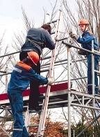 Die Leiter wird an das als Balkon dienende Podest angelehnt und mit einem Seil sowie einem Truppmann gesichert. Zwei andere steigen auf, während der „Wassertrupp“, der heute nicht gebraucht wird, die Unfallstelle mit rotweißen Pylonen absichert. Oben wird der Eingeschlossene seinerseits mit einem Seil gesichert, das mit einem Spezialknoten befestigt wird. Sollte der Mann beim Absteigen ins Seil fallen, wird so verhindert, dass er sich auch noch um die Leibesmitte verletzt. Als die Erde ihn wieder hat, wird der Gerettete auf eine Trage gelegt und dem Rettungsdienst übergeben.