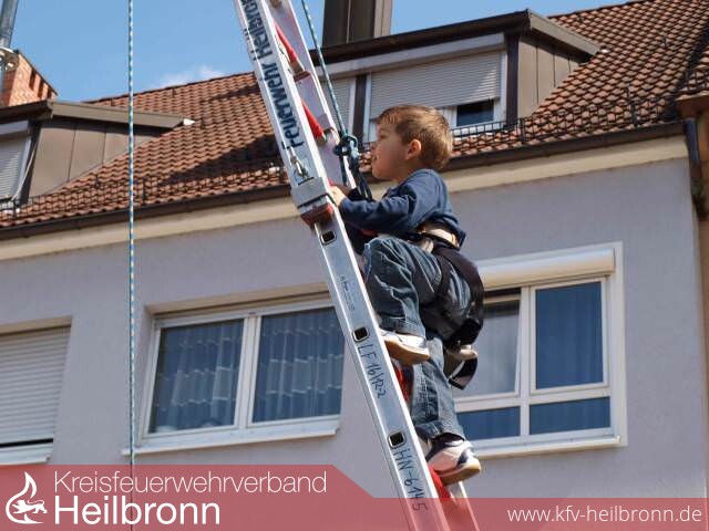 Hoch hinaus ging es auch an einem eigens für diese Veranstaltung aufgestellten Gerüstturm. Gesichert durch Höhenretter hatten die Kinder hier die Möglichkeit Feuerwehrleitern zu besteigen. Auch für die kleinsten Teilnehmer war Höhenangst ein Fremdwort und erreichten den Schalter für die Signalhupe an der obersten Sprosse.