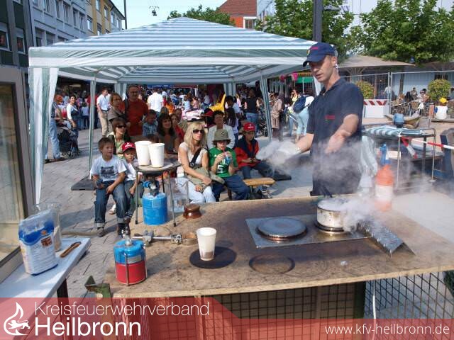 Brandschutztipps der besonderen Art mit anschaulichen Versuchen wurden den Kindern, aber auch den Eltern, in einer Art „Knoff-Hoff-Show“ der Feuerwehr vermittelt. Die Gefahren einer Staubexplosion oder auch was passiert, wenn man Fettbrände mit Wasser bekämpft, wurde hier unter fachkundiger Anleitung demonstriert.