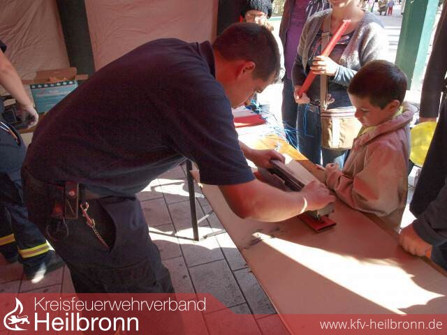 Viel zu erleben hatten die Kinder an den Stationen der Feuerwehr Heilbronn. Neben einer Fahrzeugausstellung mit fachkundiger Beratung, konnten die Kinder an einem Glücksrad Fahrten mit der Feuerwehrdrehleiter gewinnen.